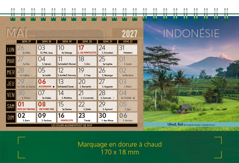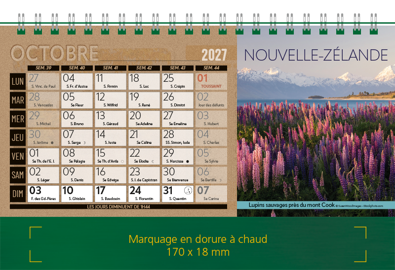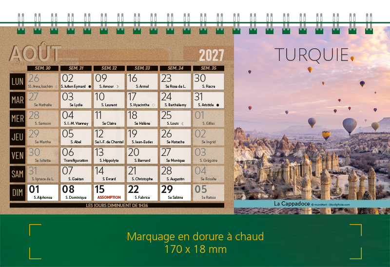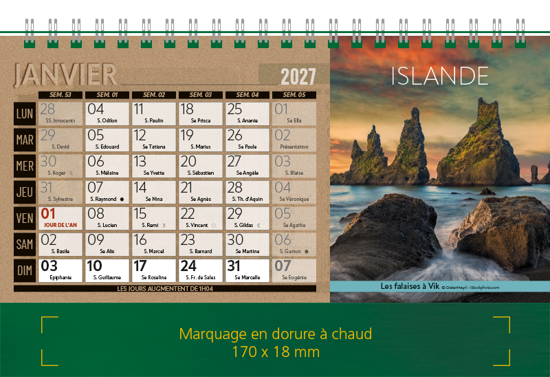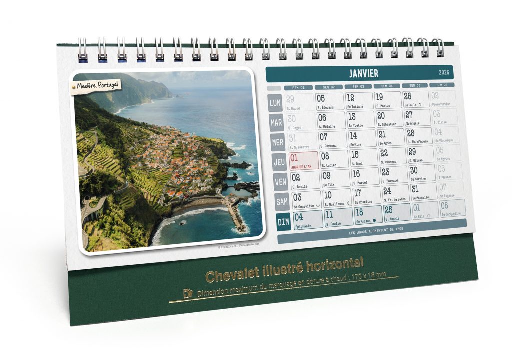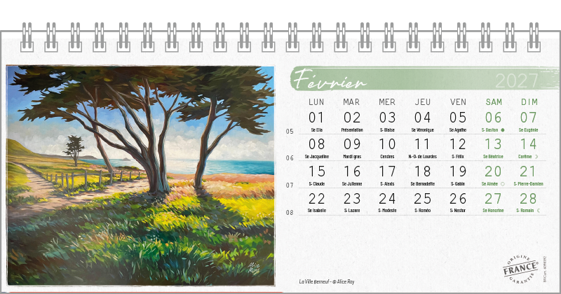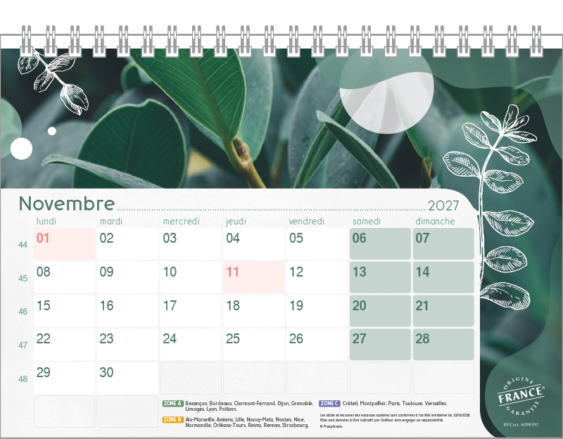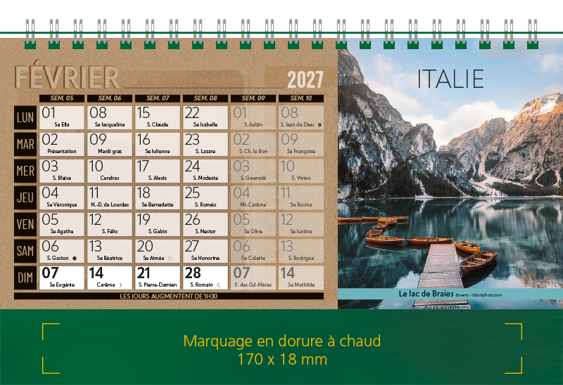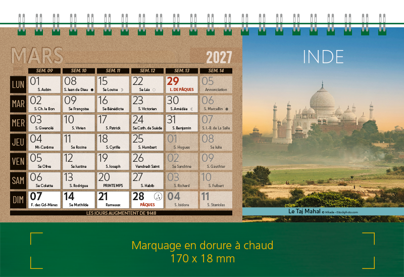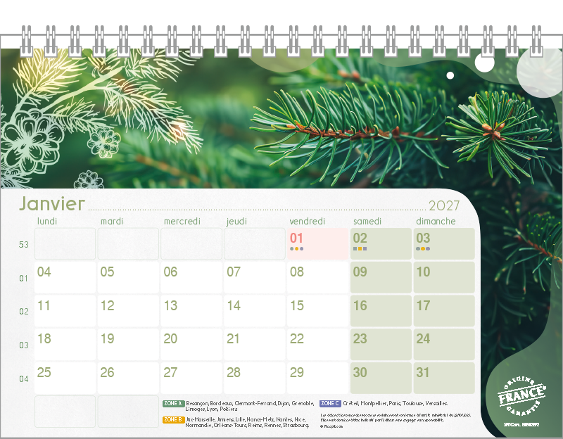 Support Pelline verte dorure à chaud. Blocs 12 feuillets imprimés recto/verso. Reliure spirale blanche. Grille mensuelle Fêtes / N°semaine / Lunaisons