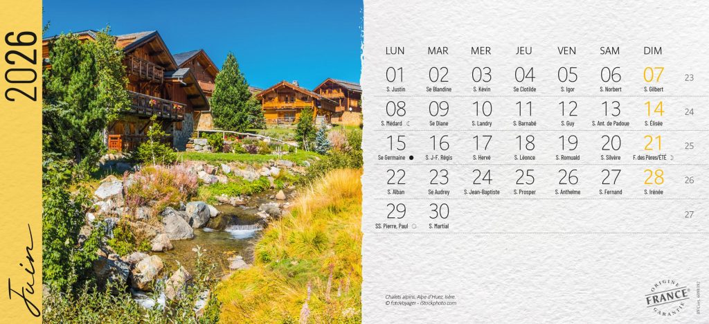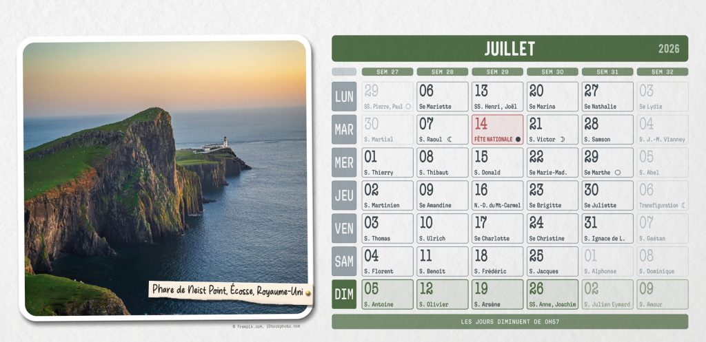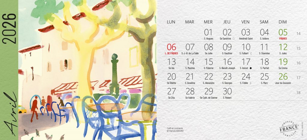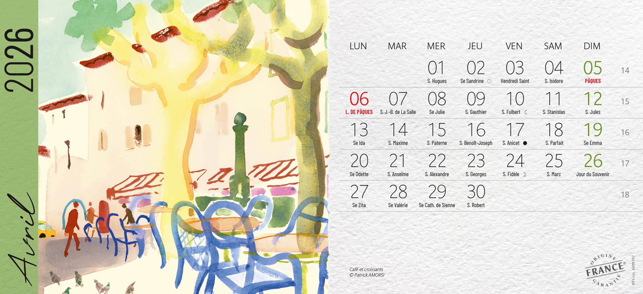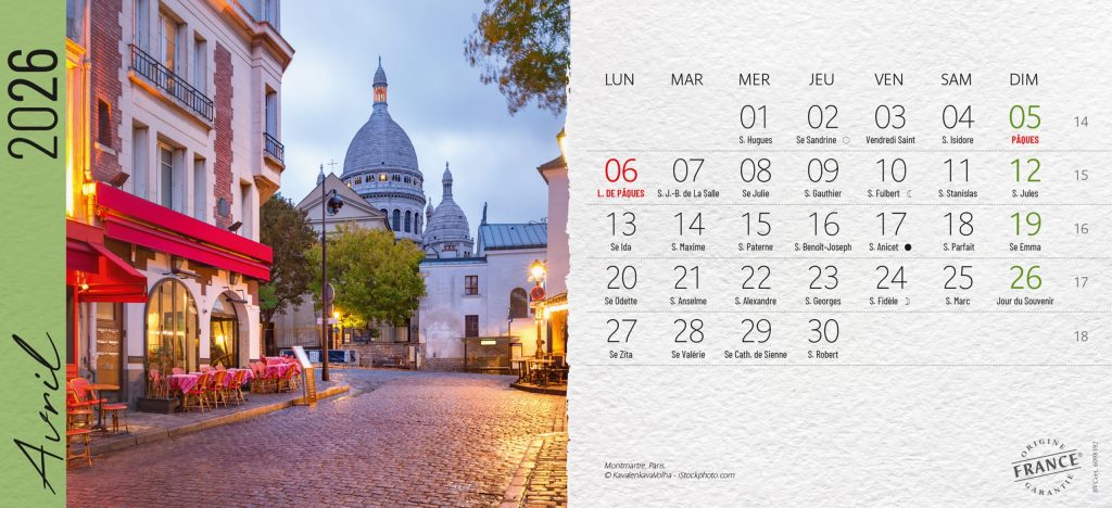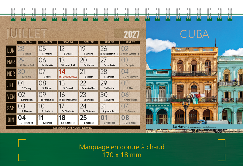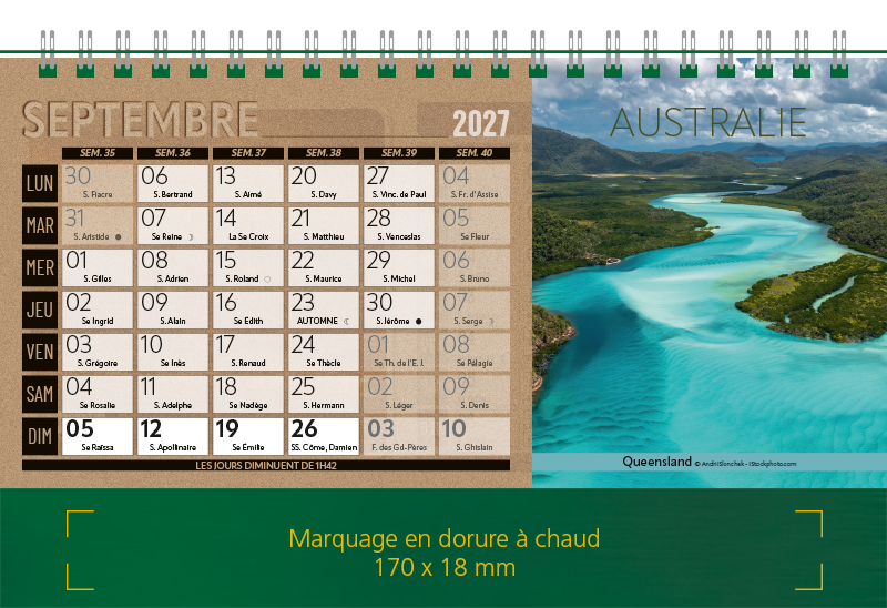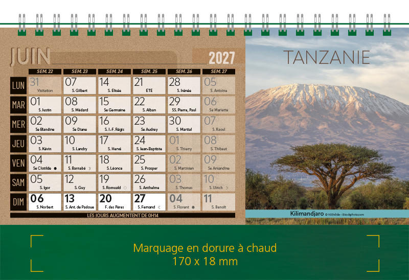 Support Pelline verte dorure à chaud. Blocs 12 feuillets imprimés recto/verso. Reliure spirale blanche. Grille mensuelle Fêtes / N°semaine / Lunaisons