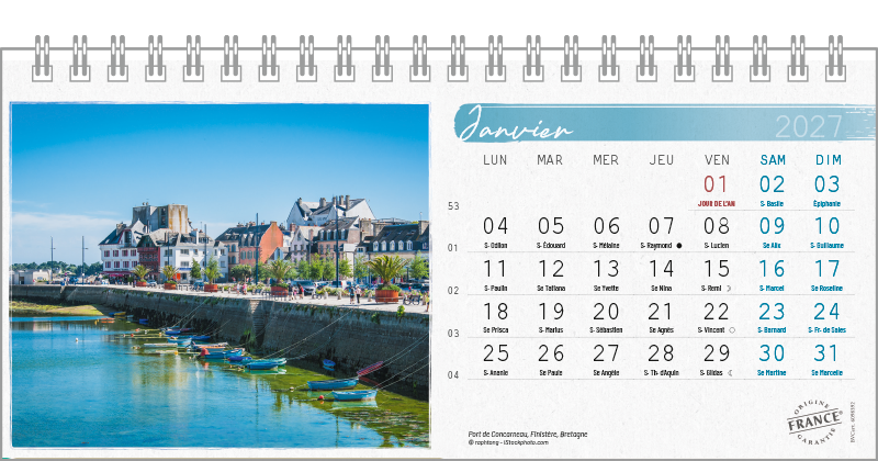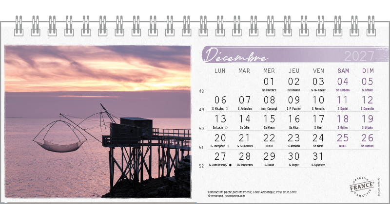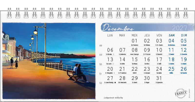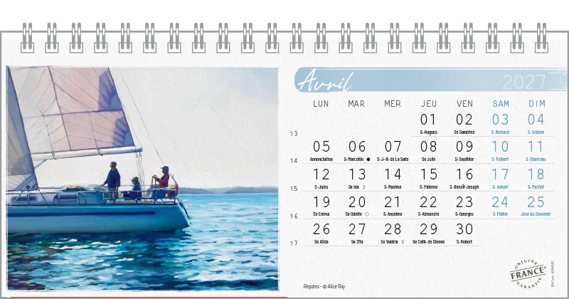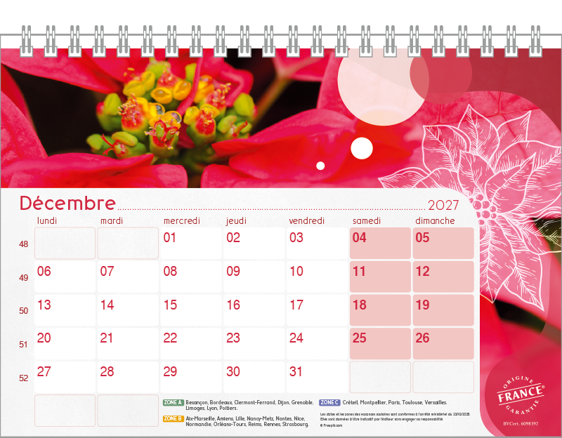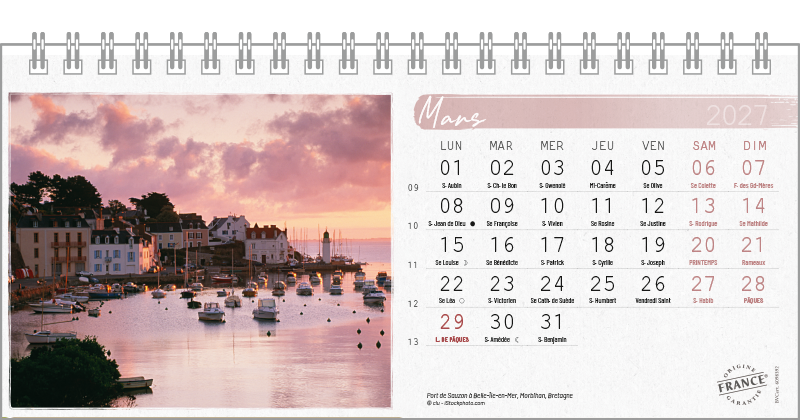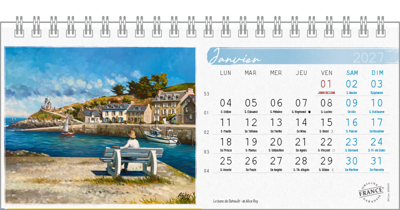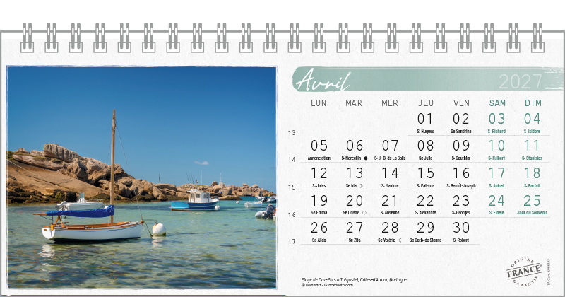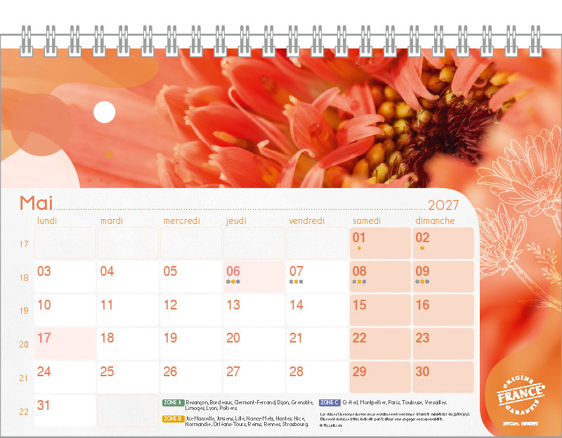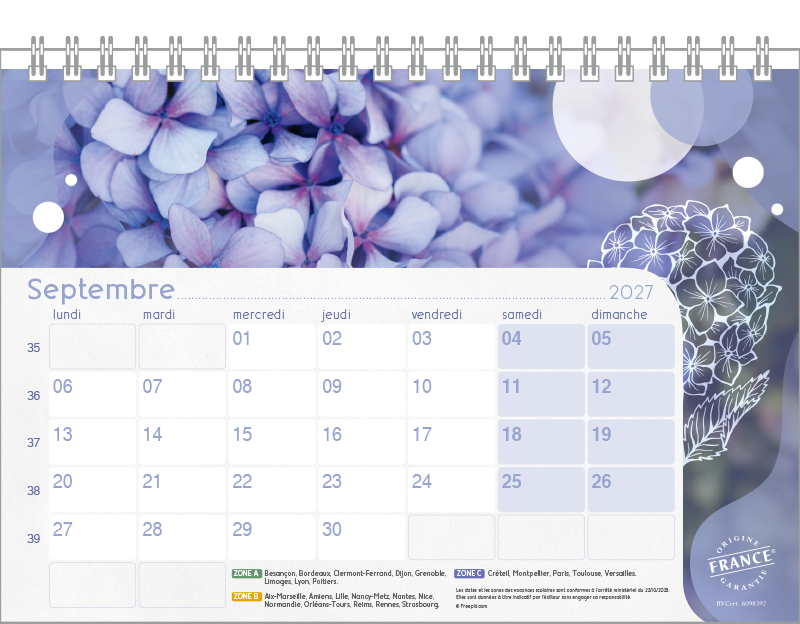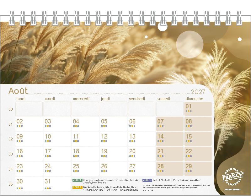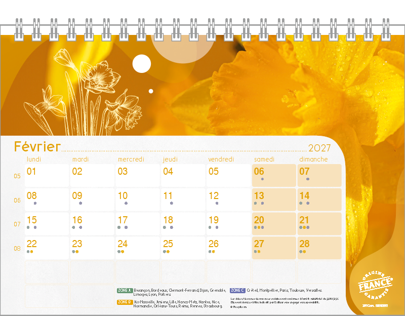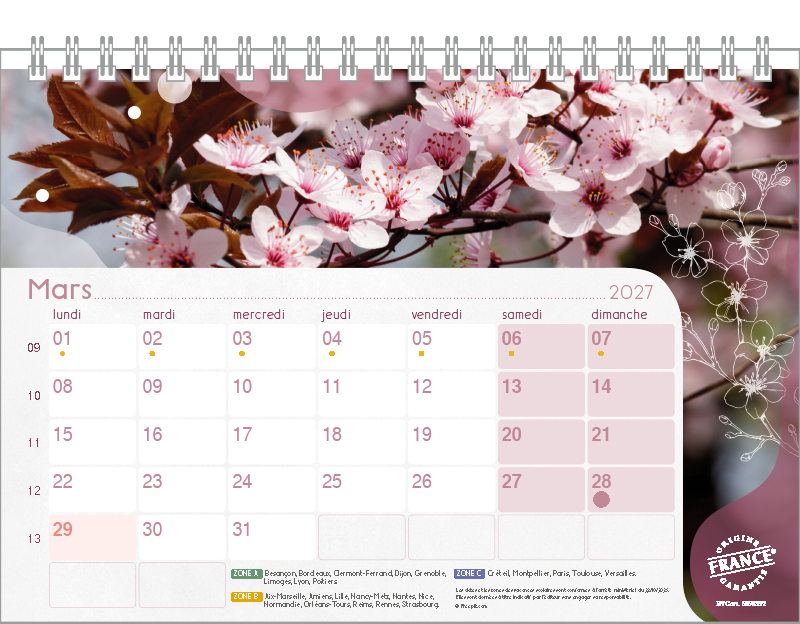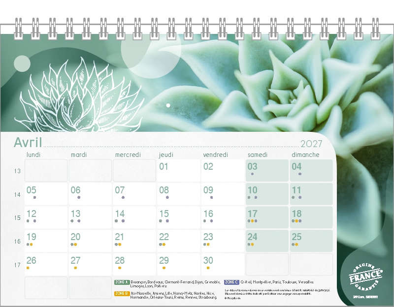Support pvc blanc. Blocs 13 ou 14 feuillets imprimés recto/verso. Reliure spirale blanche. Grille mensuelle Fêtes / N°semaine / Lunaisons