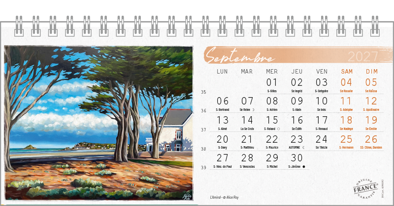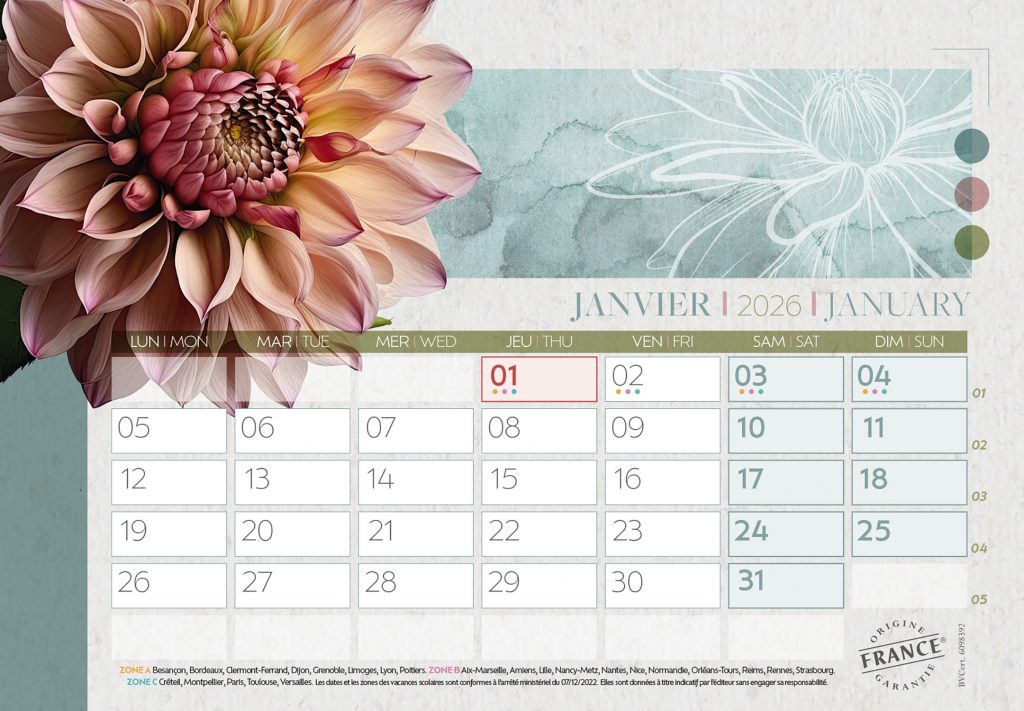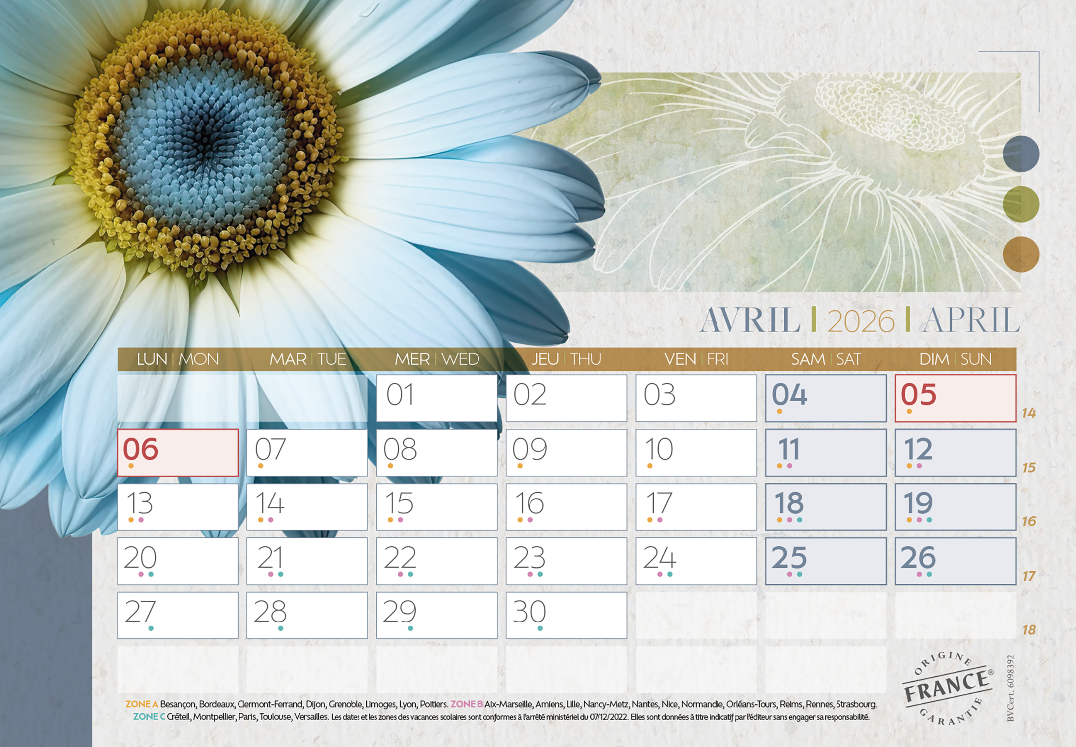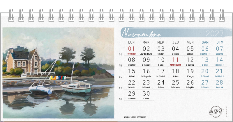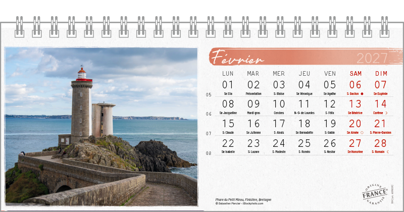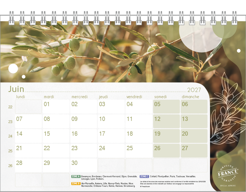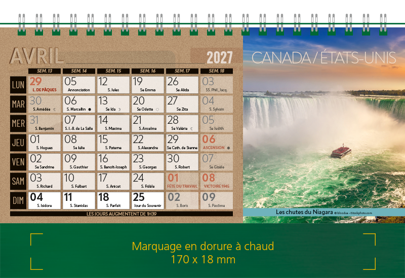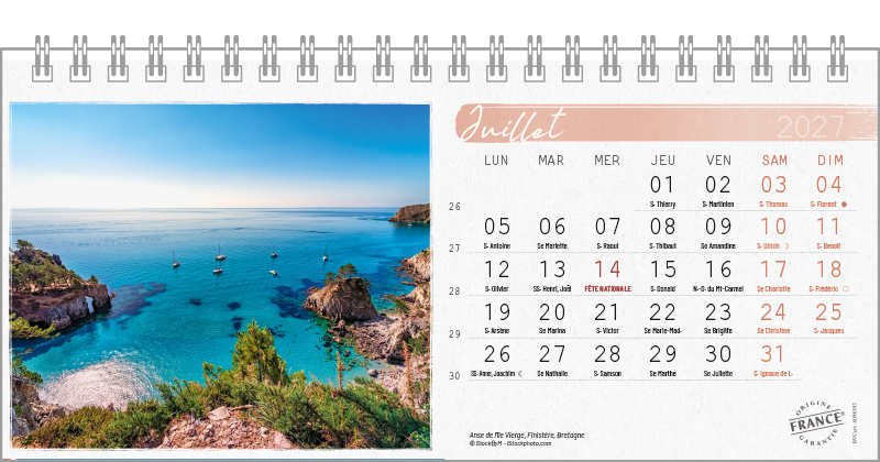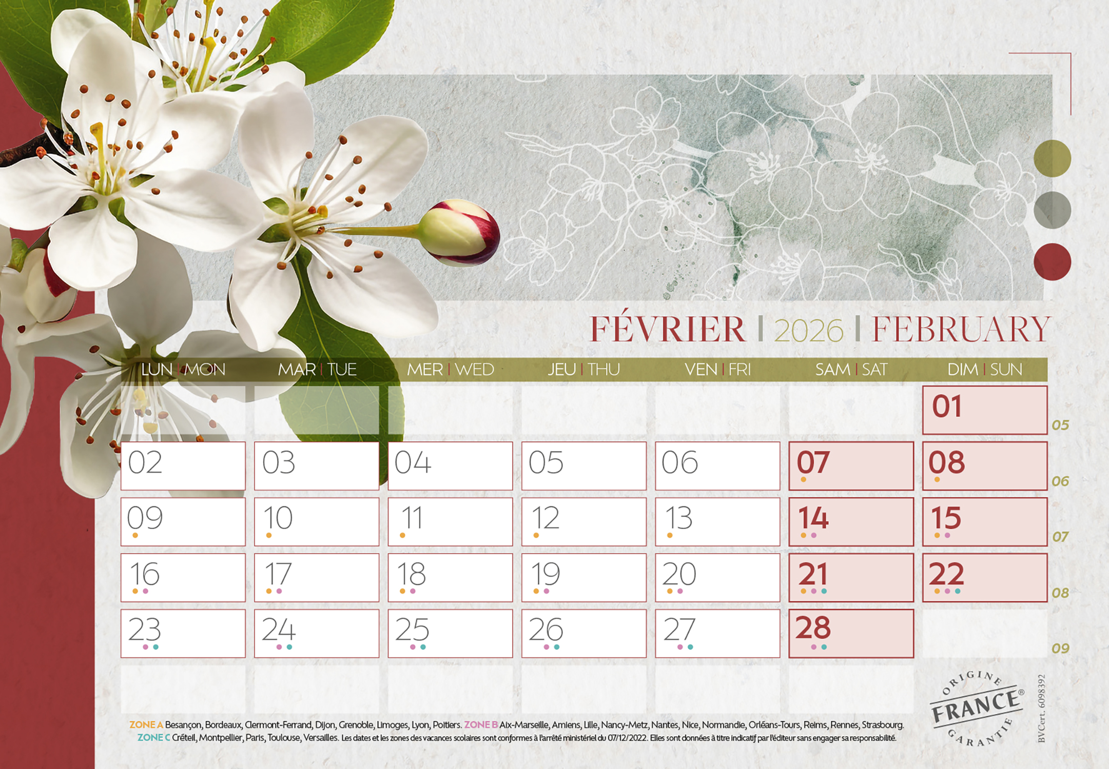 Support pvc blanc. Blocs 13 ou 14 feuillets imprimés recto/verso. Reliure spirale blanche. Grille mensuelle Fêtes / N°semaine / Lunaisons