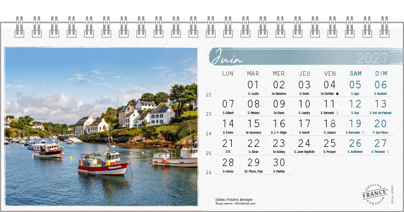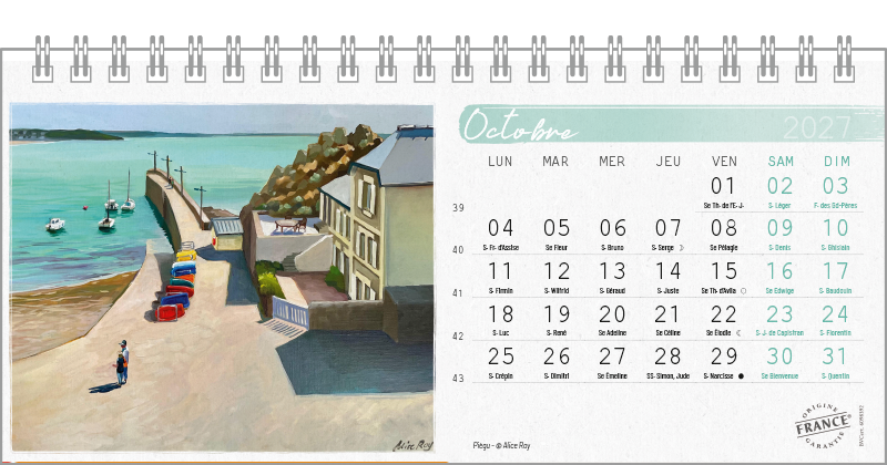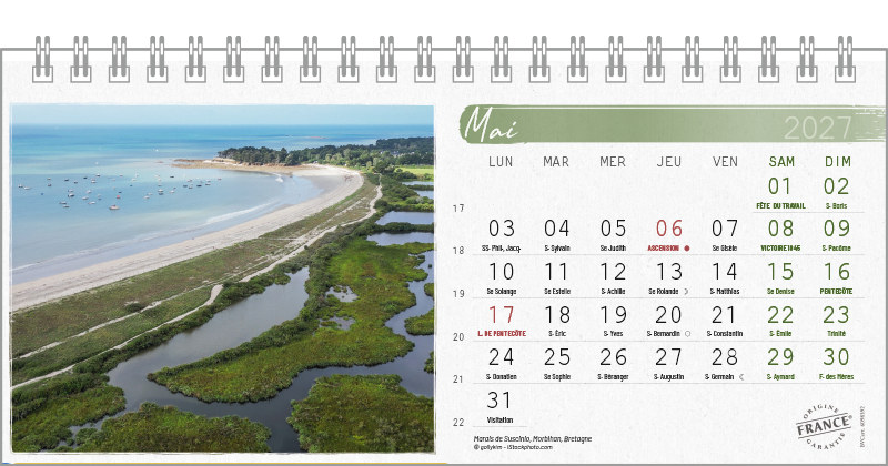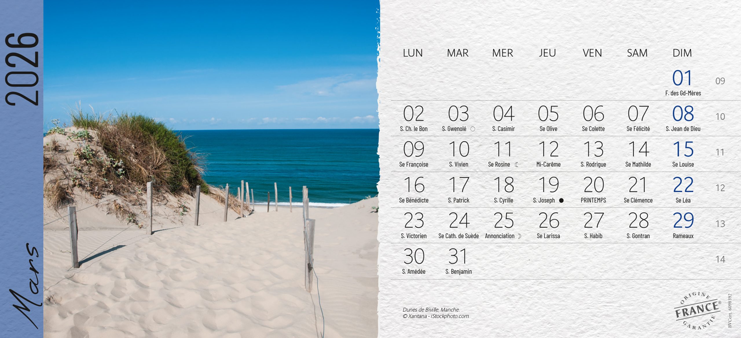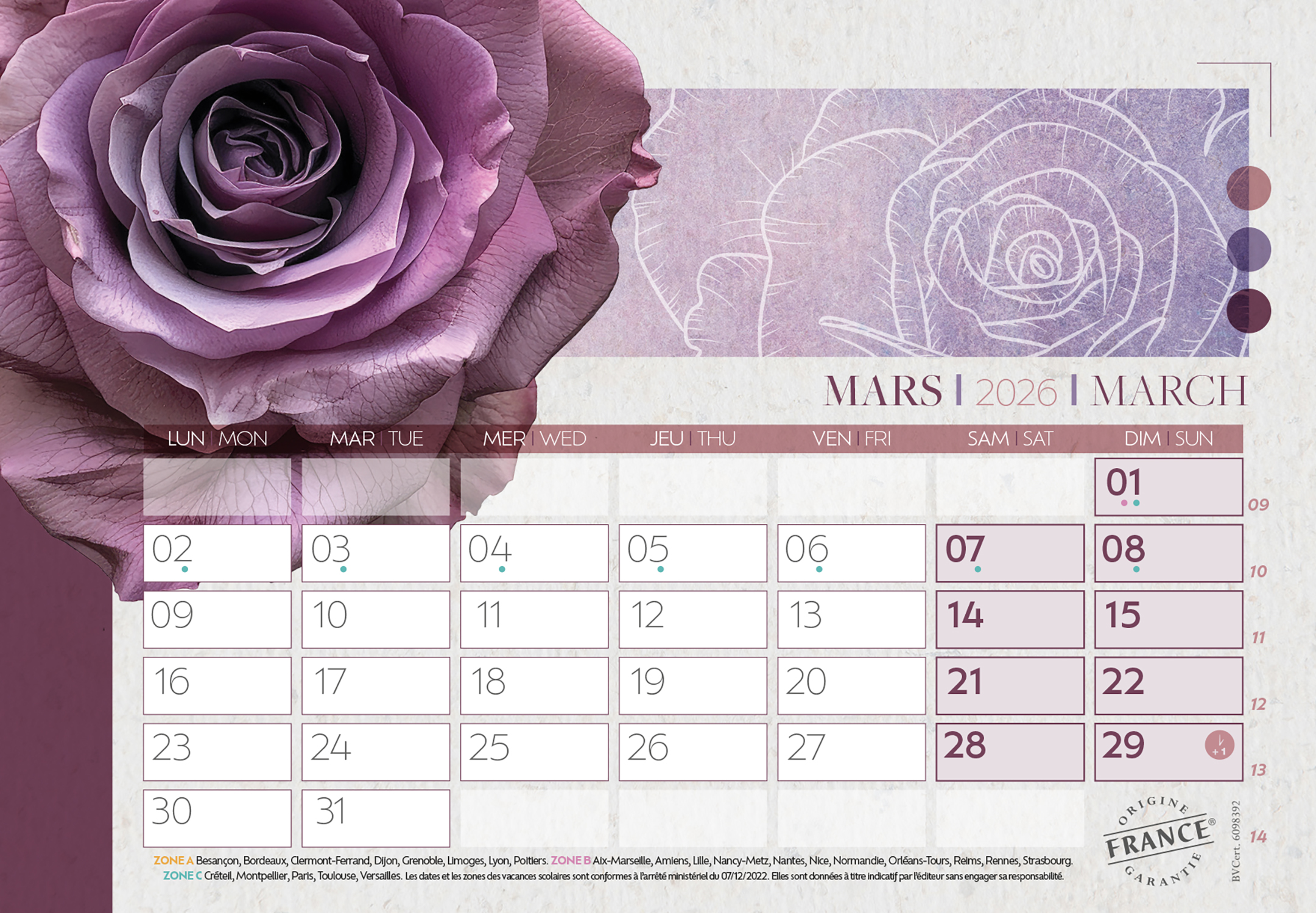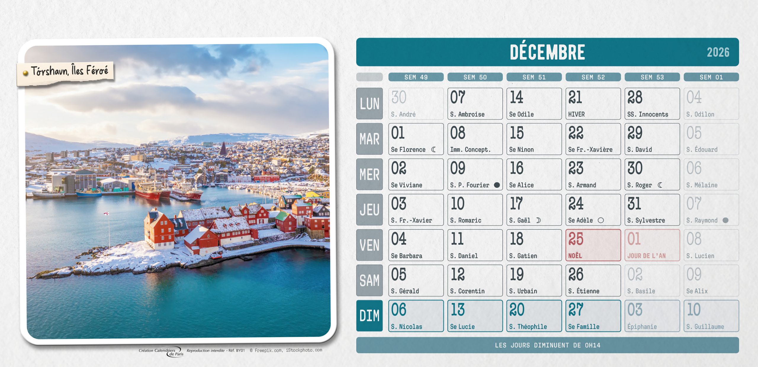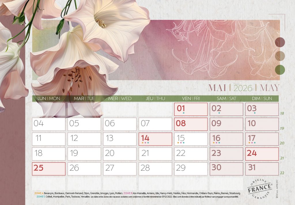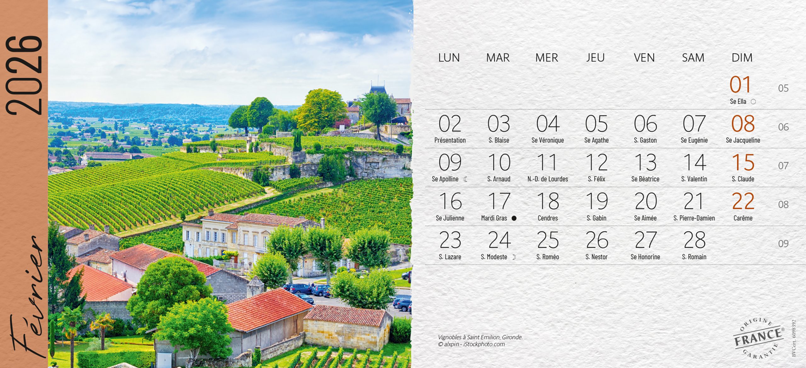 Support pvc blanc. Blocs 13 ou 14 feuillets imprimés recto/verso. Reliure spirale blanche. Grille mensuelle Fêtes / N°semaine / Lunaisons