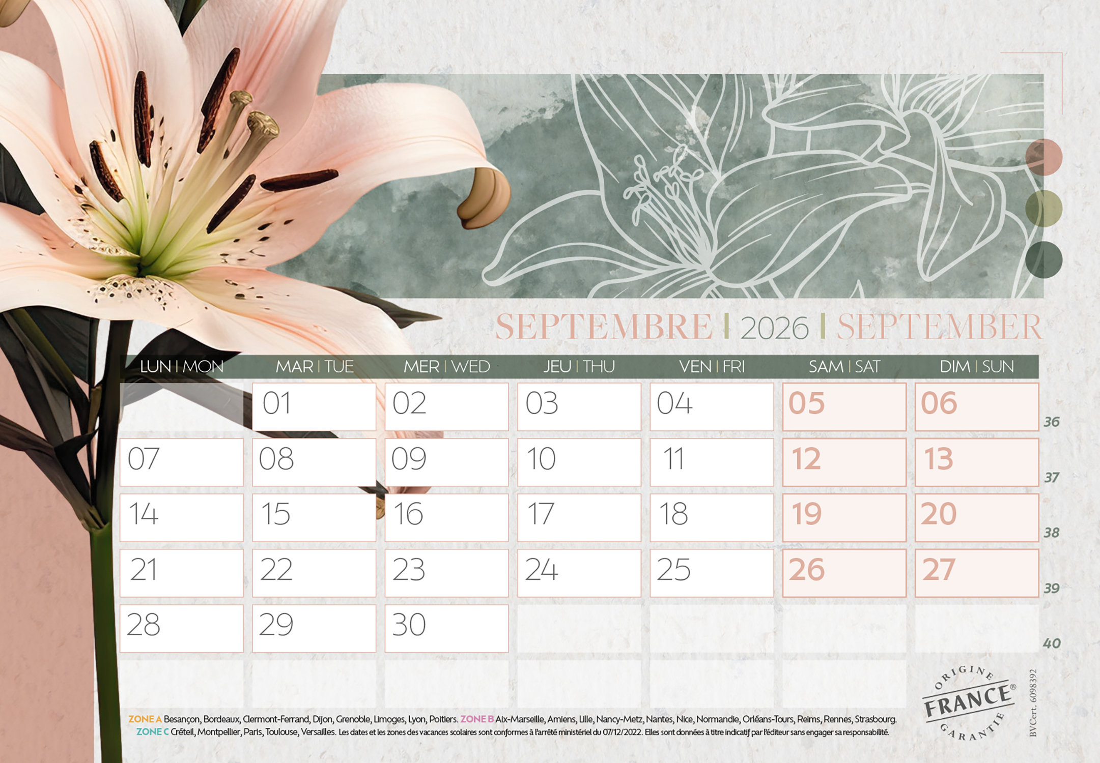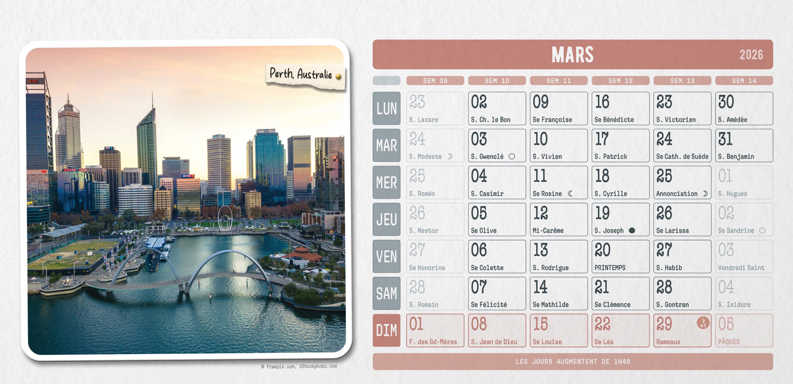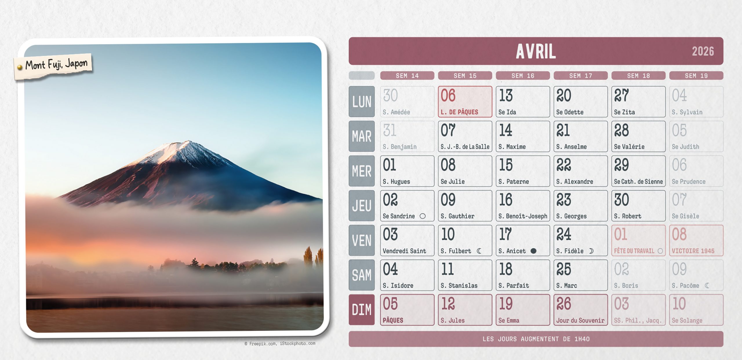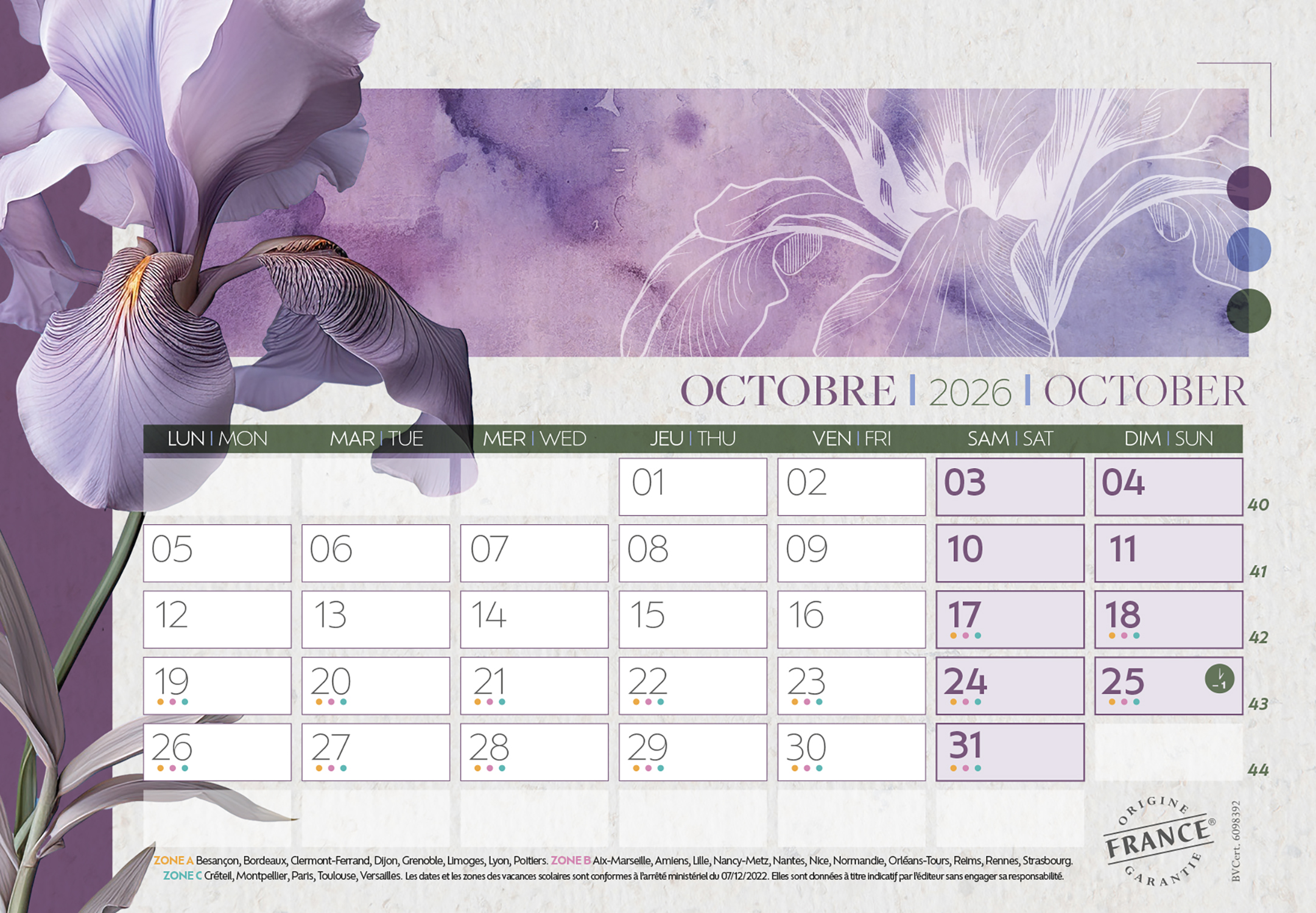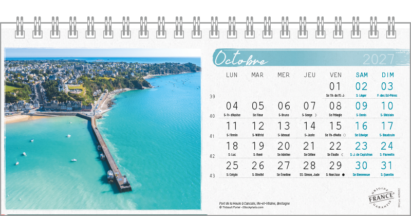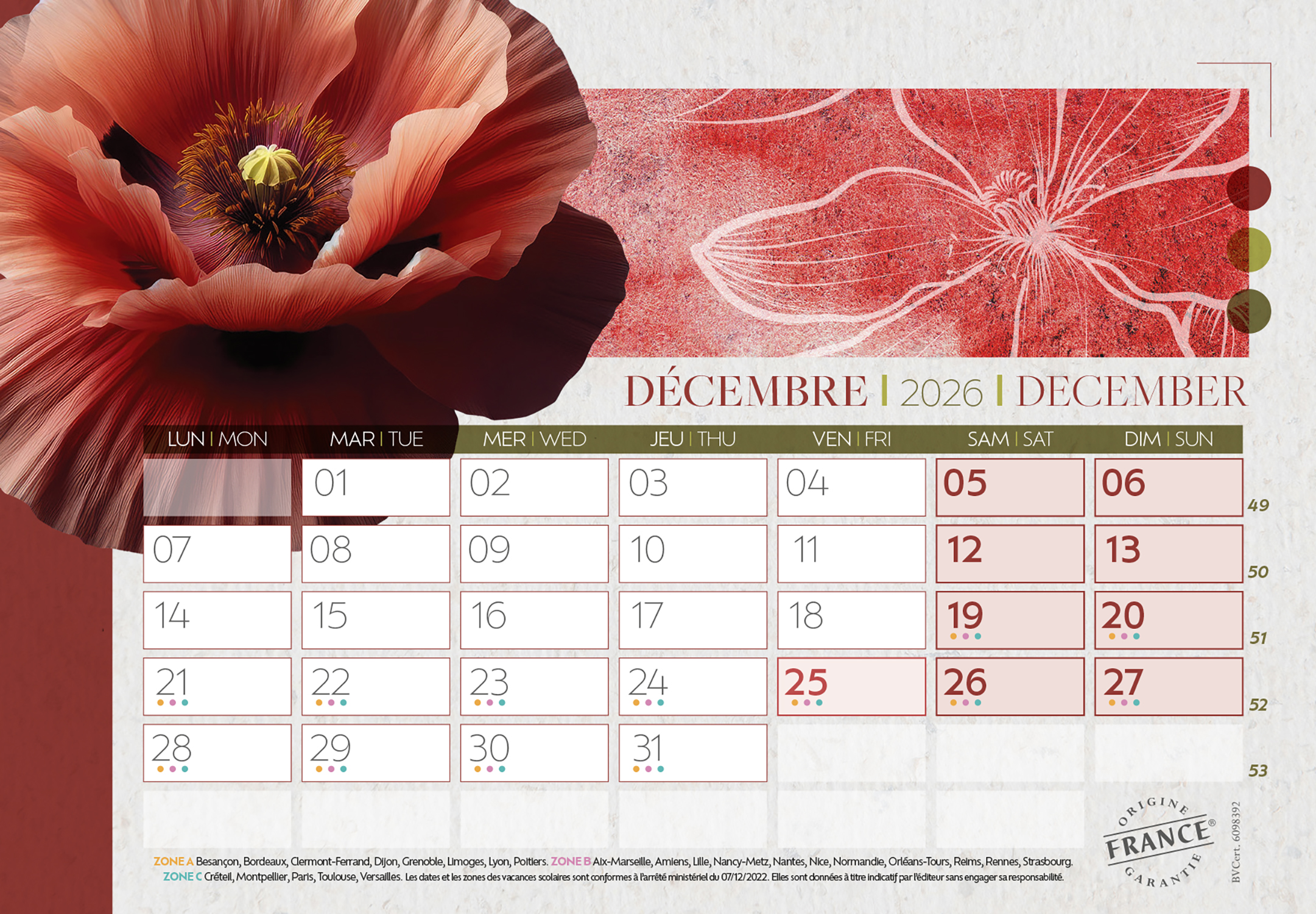 Support pvc blanc. Blocs 13 ou 14 feuillets imprimés recto/verso. Reliure spirale blanche. Grille mensuelle Fêtes / N°semaine / Lunaisons