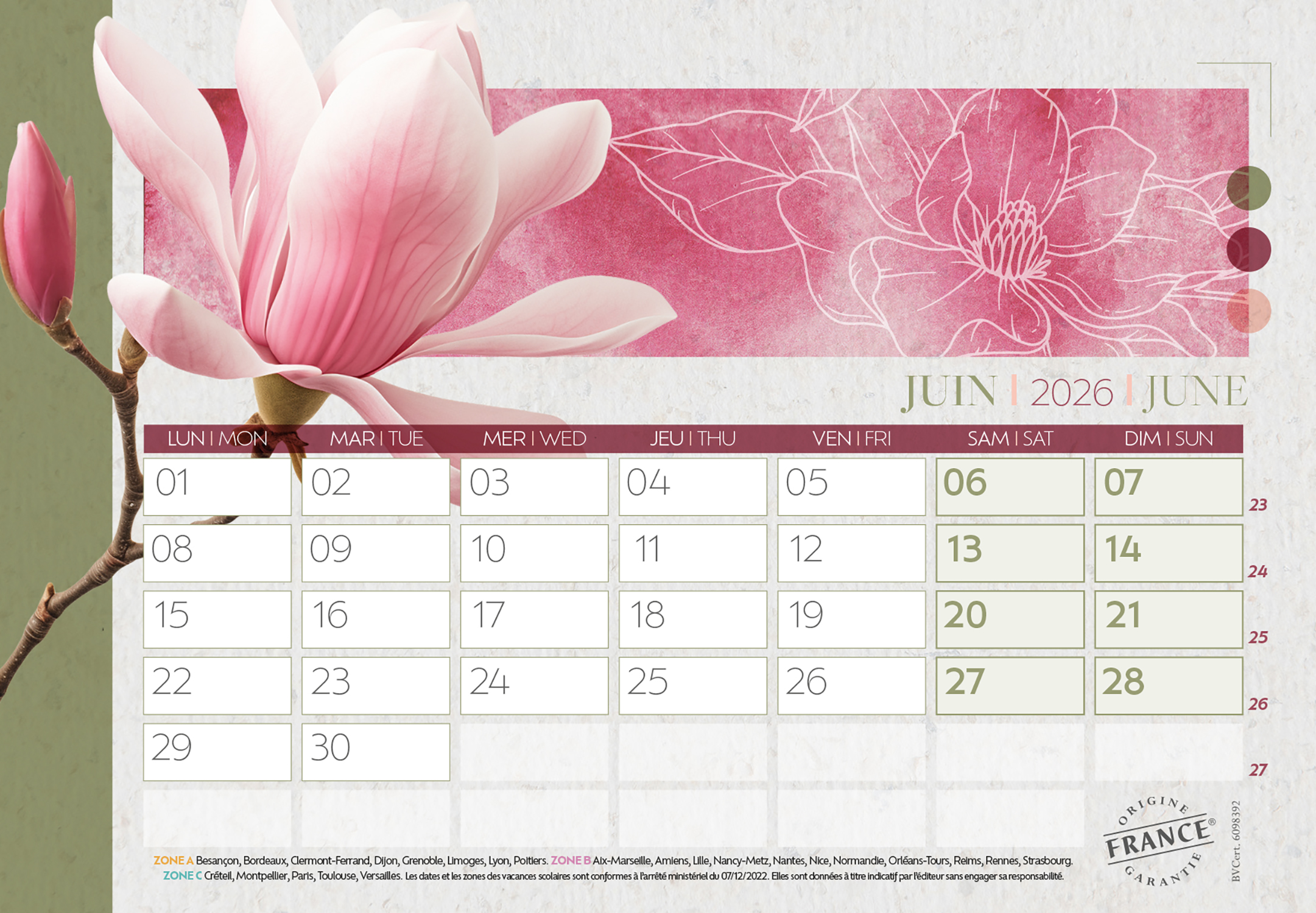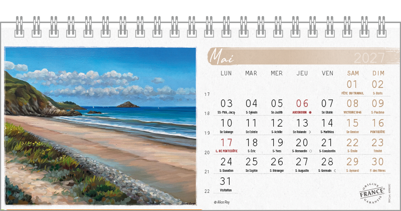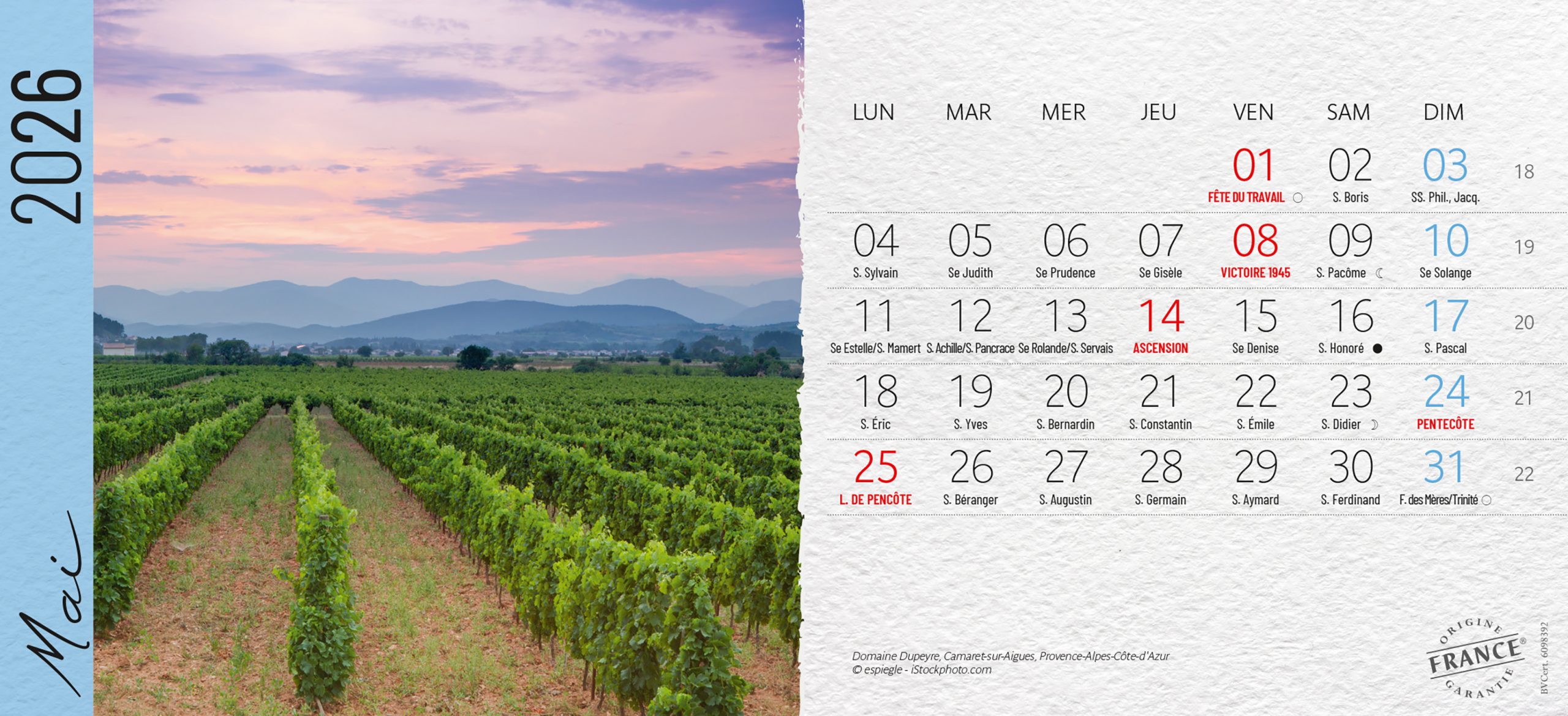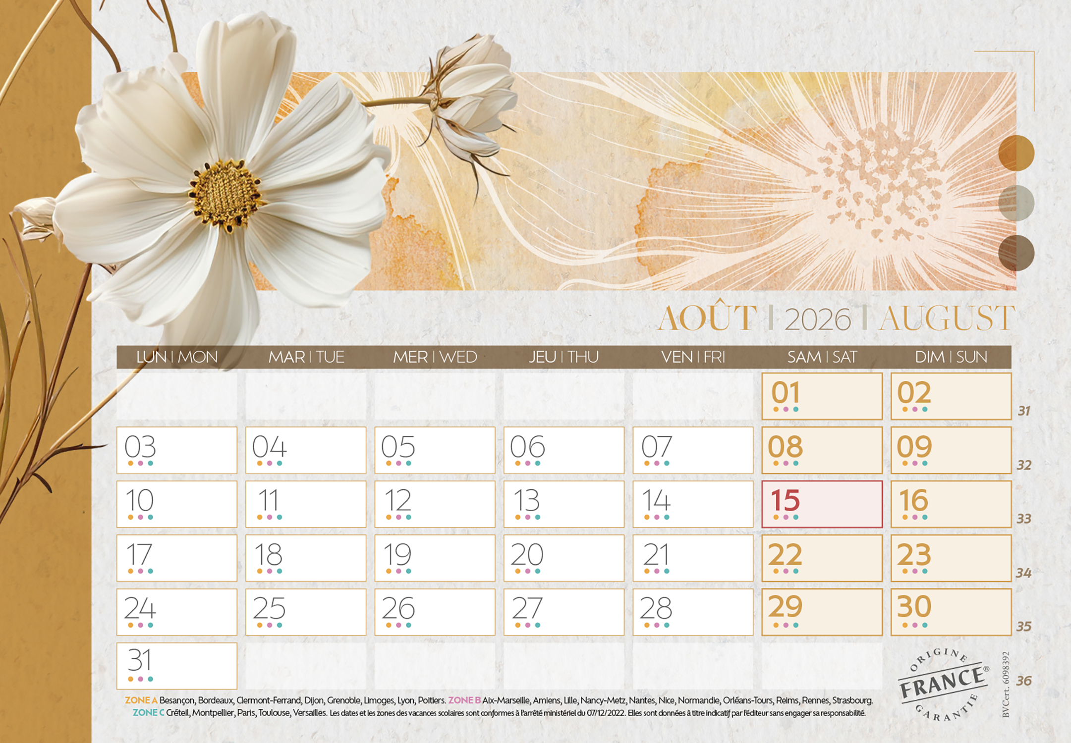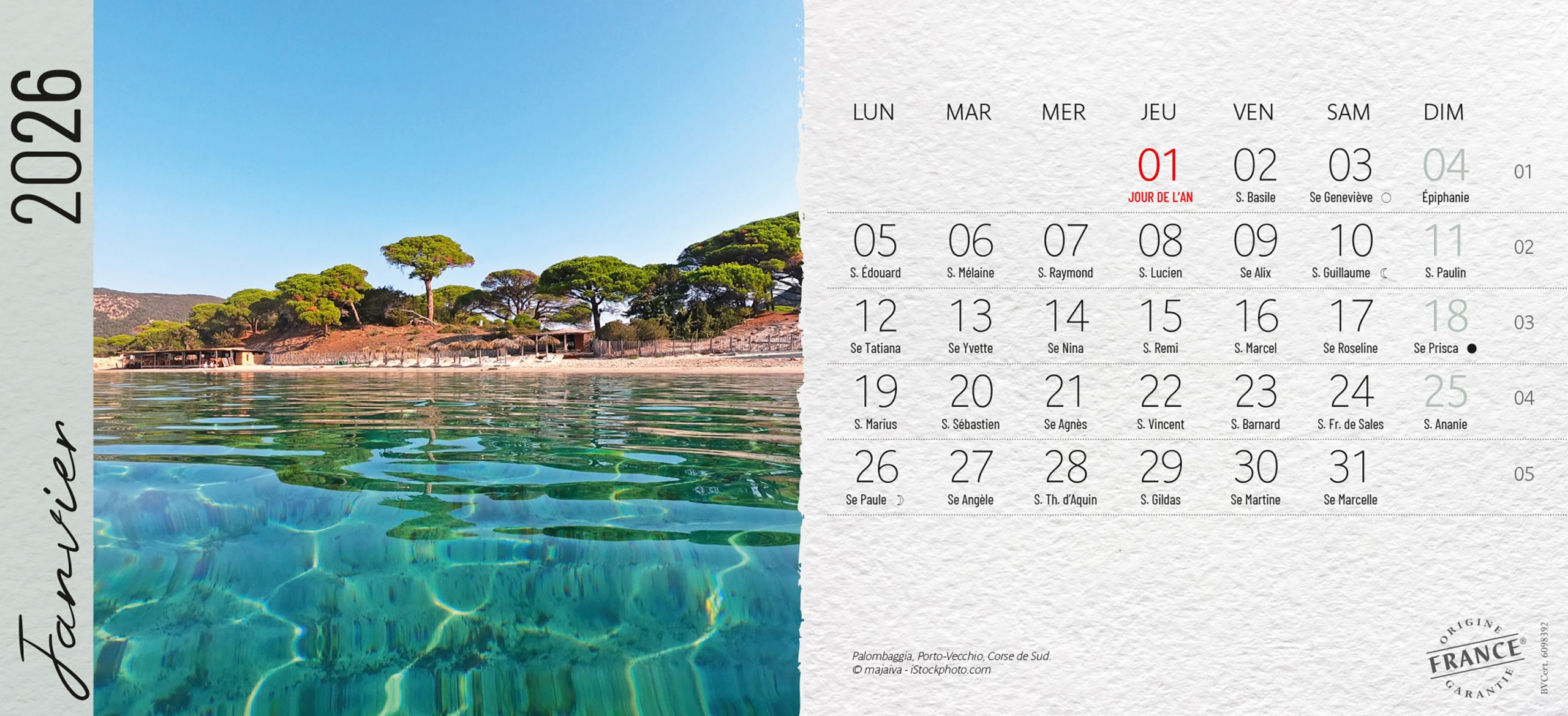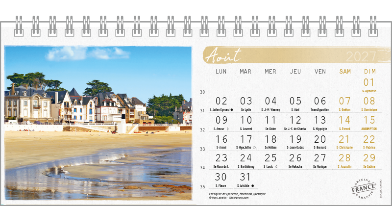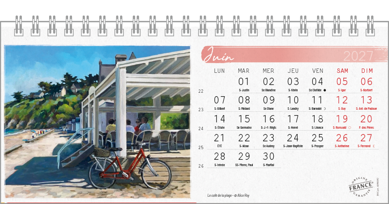Support pvc blanc. Blocs 13 ou 14 feuillets imprimés recto/verso. Reliure spirale blanche. Grille mensuelle Fêtes / N°semaine / Lunaisons