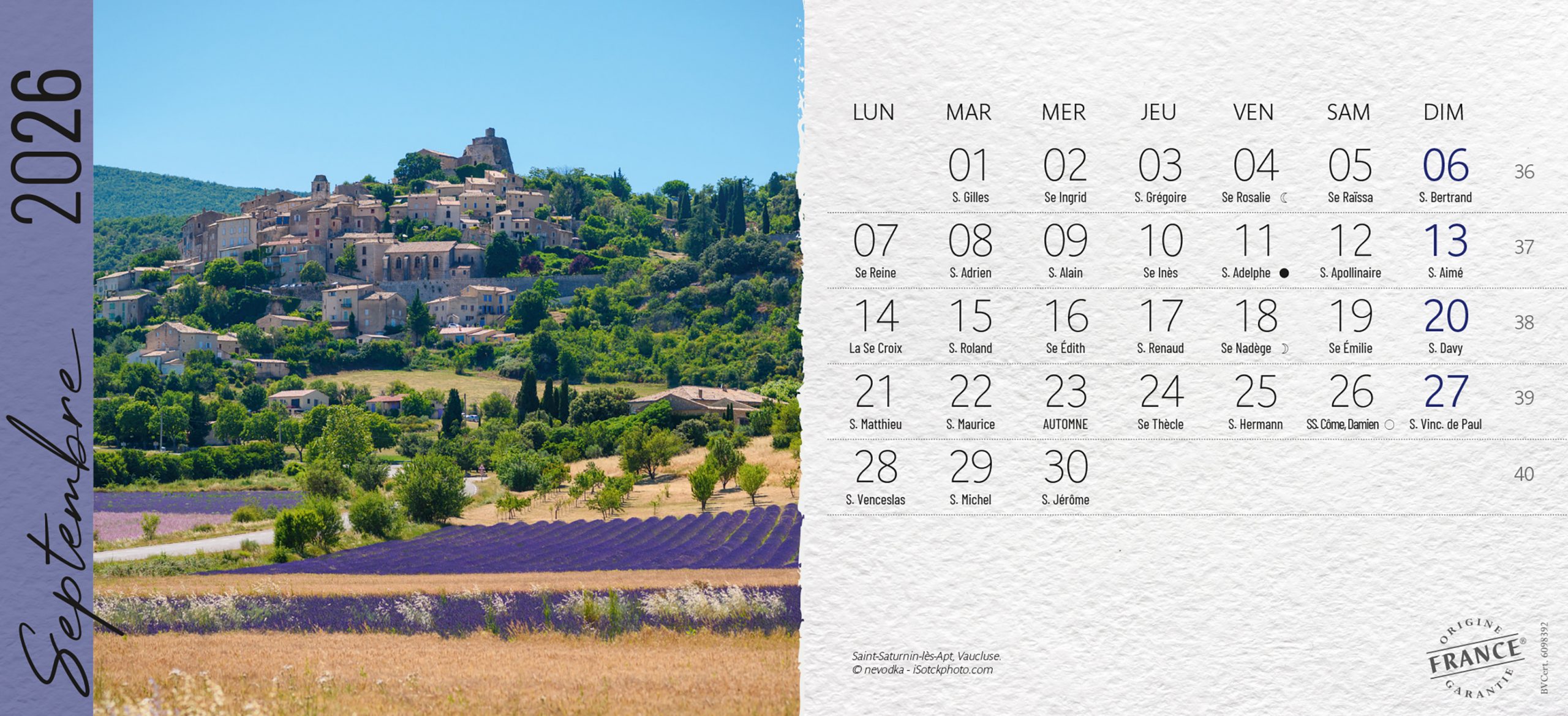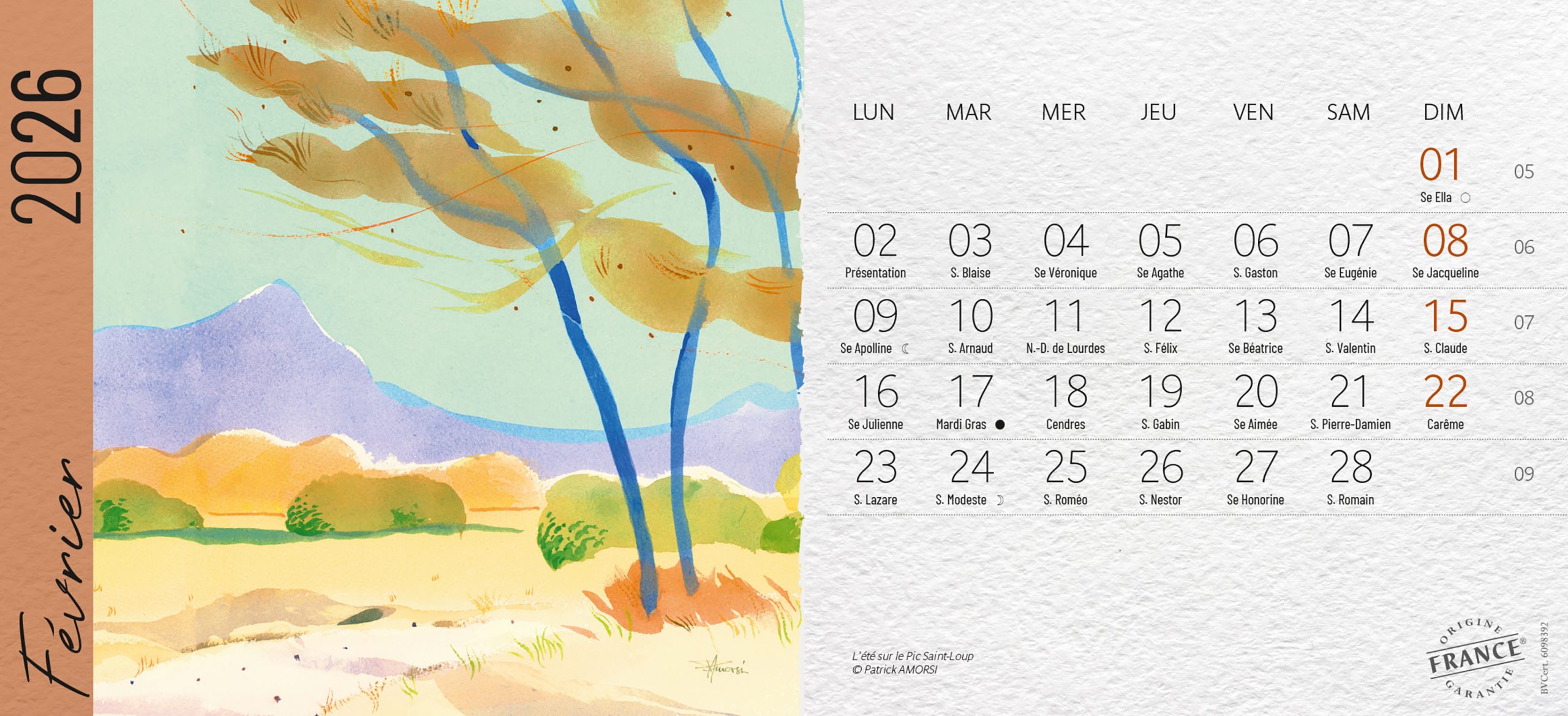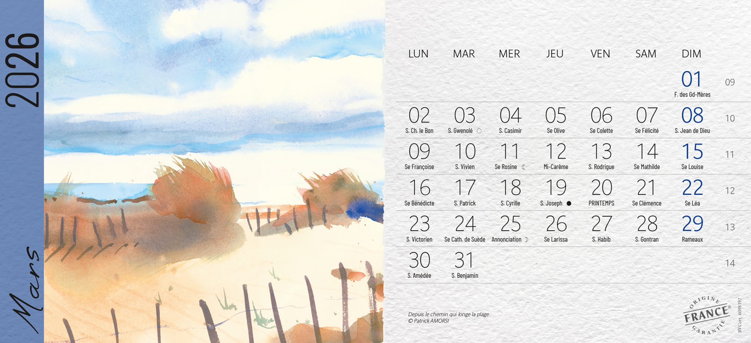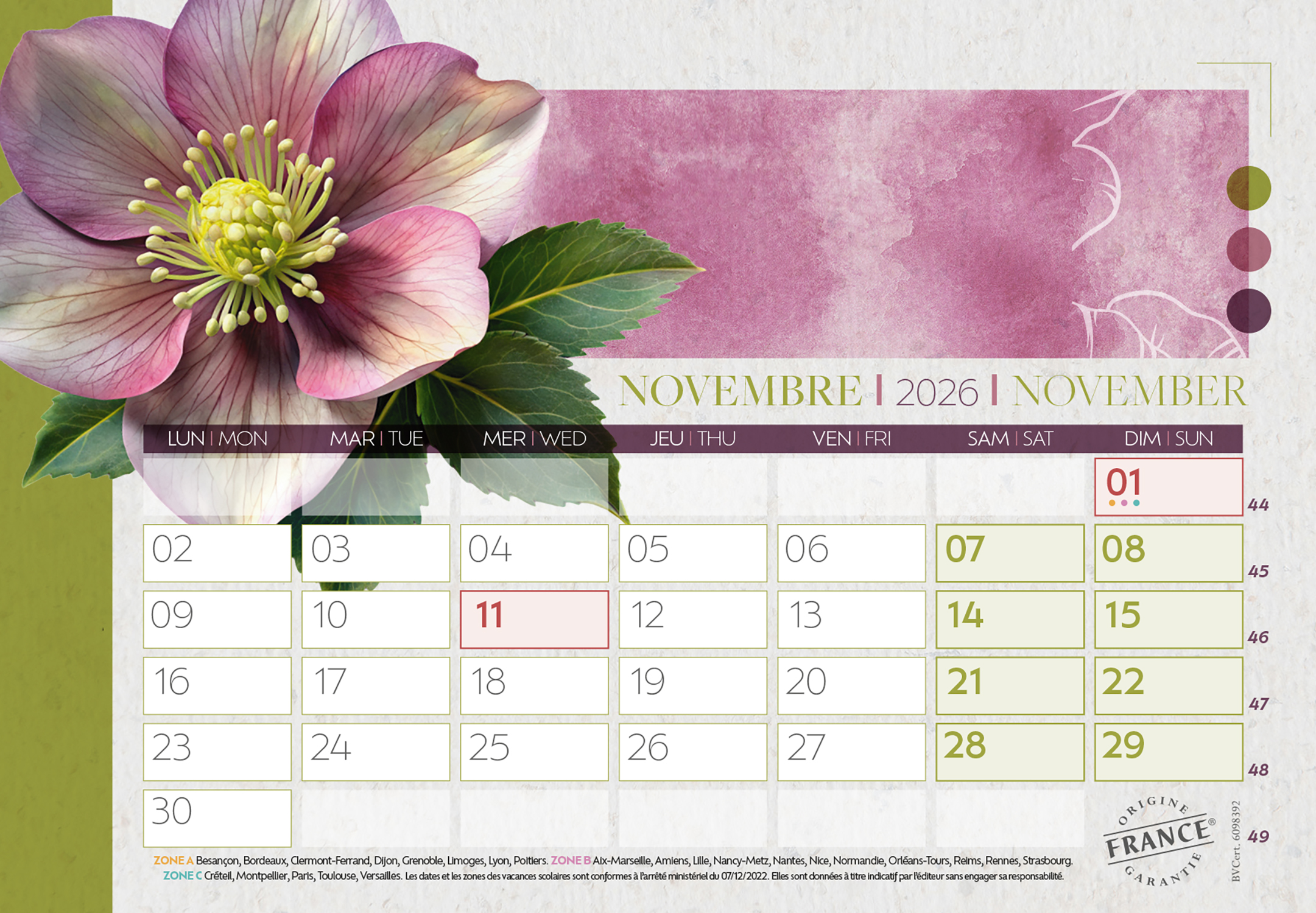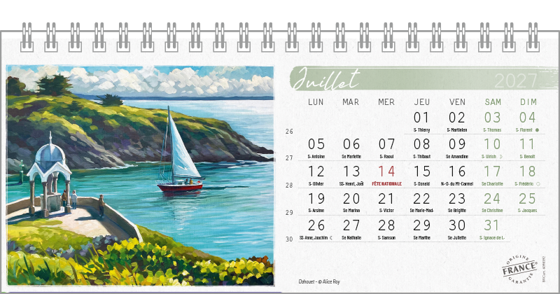 Support pvc blanc. Blocs 13 ou 14 feuillets imprimés recto/verso. Reliure spirale blanche. Grille mensuelle Fêtes / N°semaine / Lunaisons