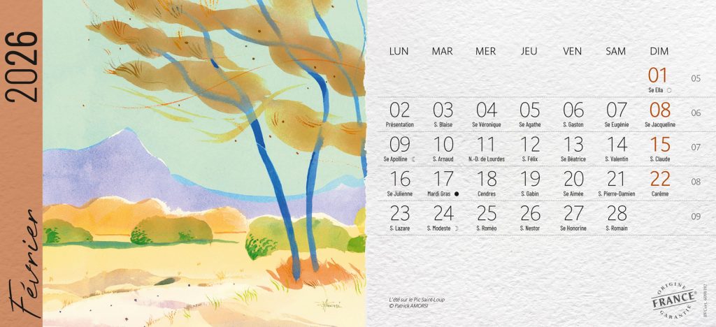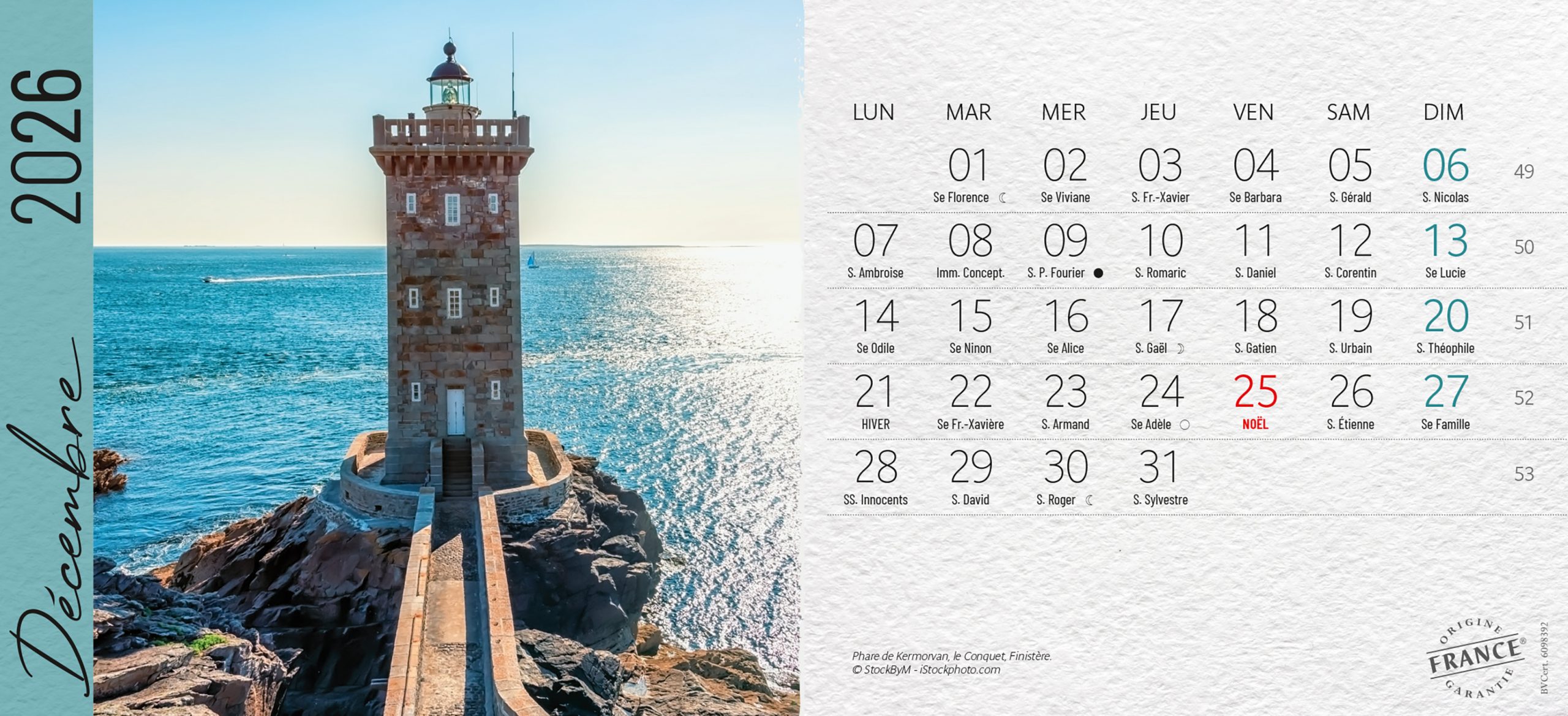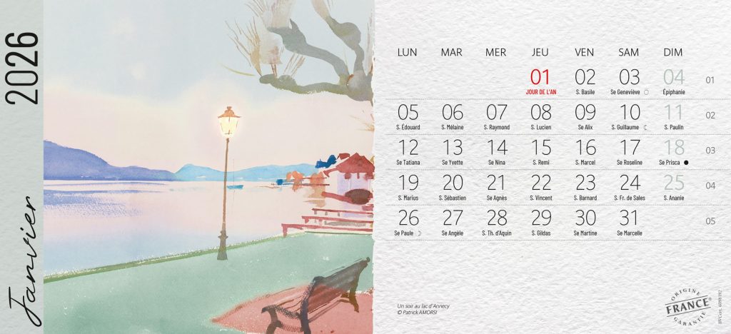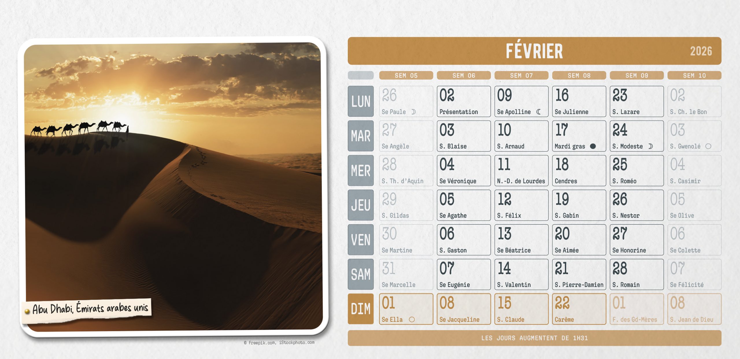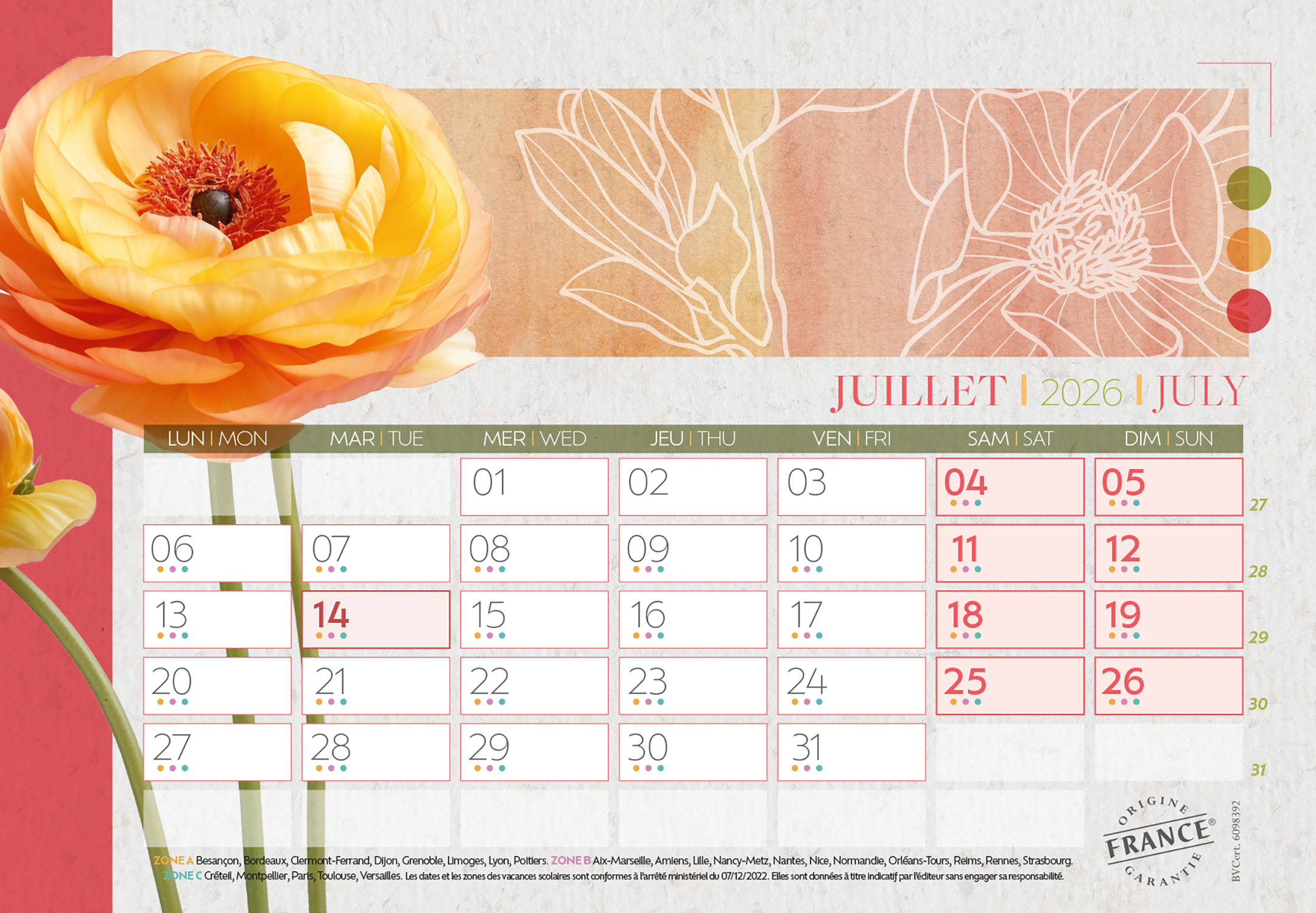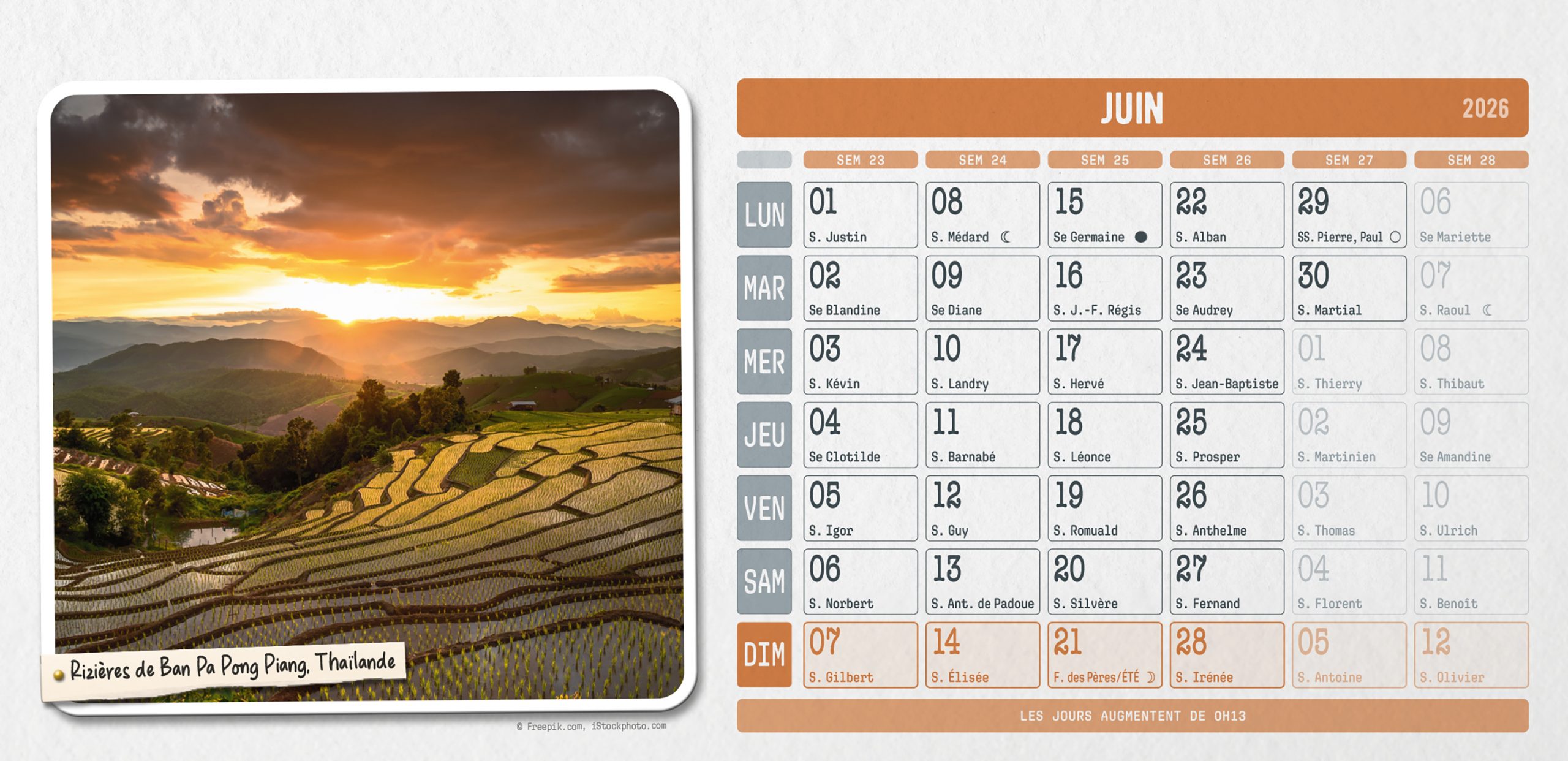 Support pvc blanc. Blocs 13 ou 14 feuillets imprimés recto/verso. Reliure spirale blanche. Grille mensuelle Fêtes / N°semaine / Lunaisons