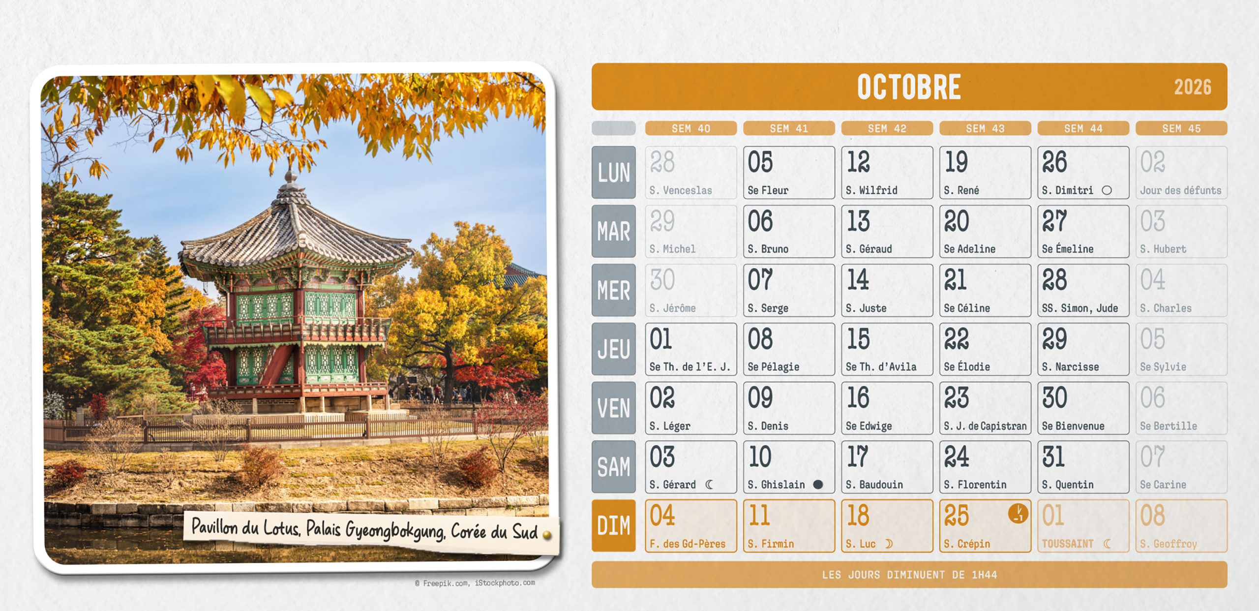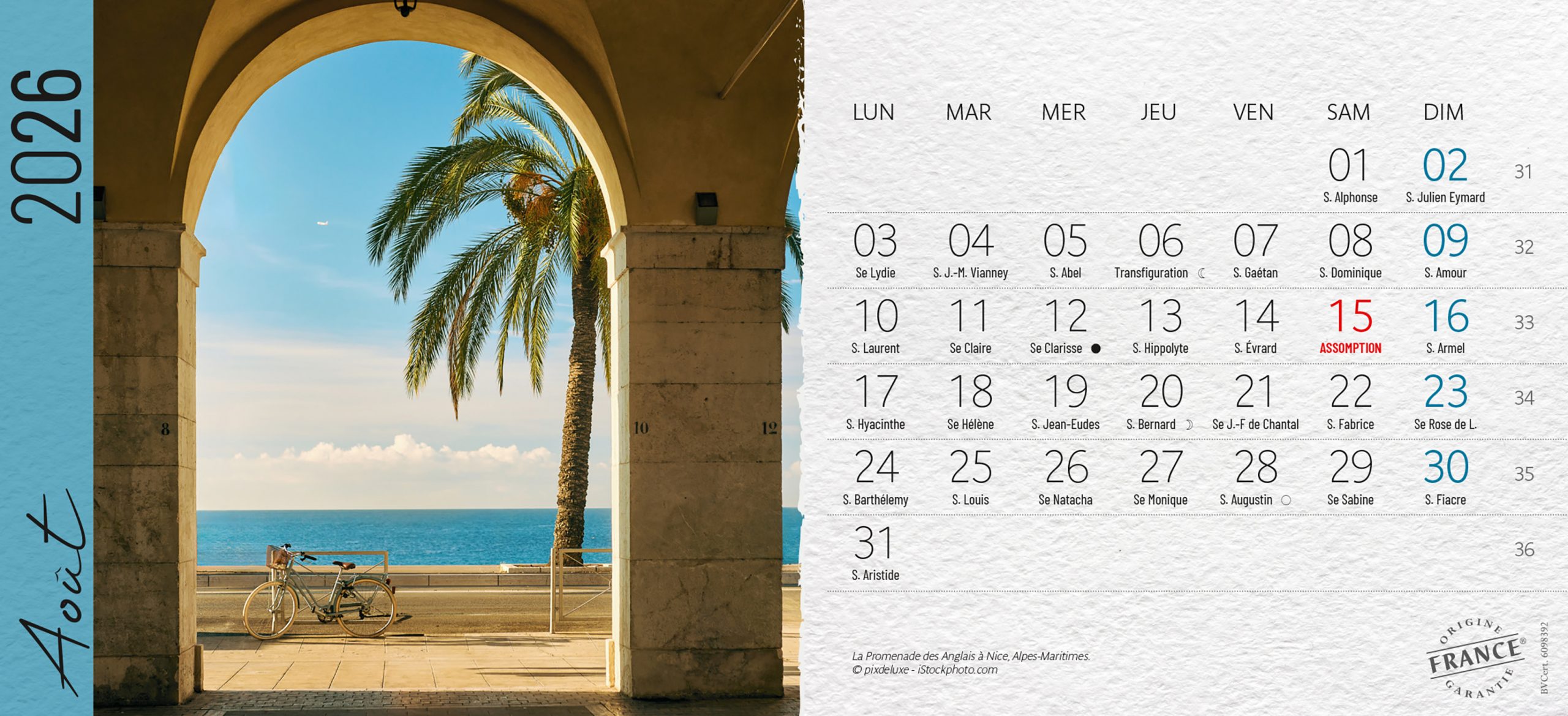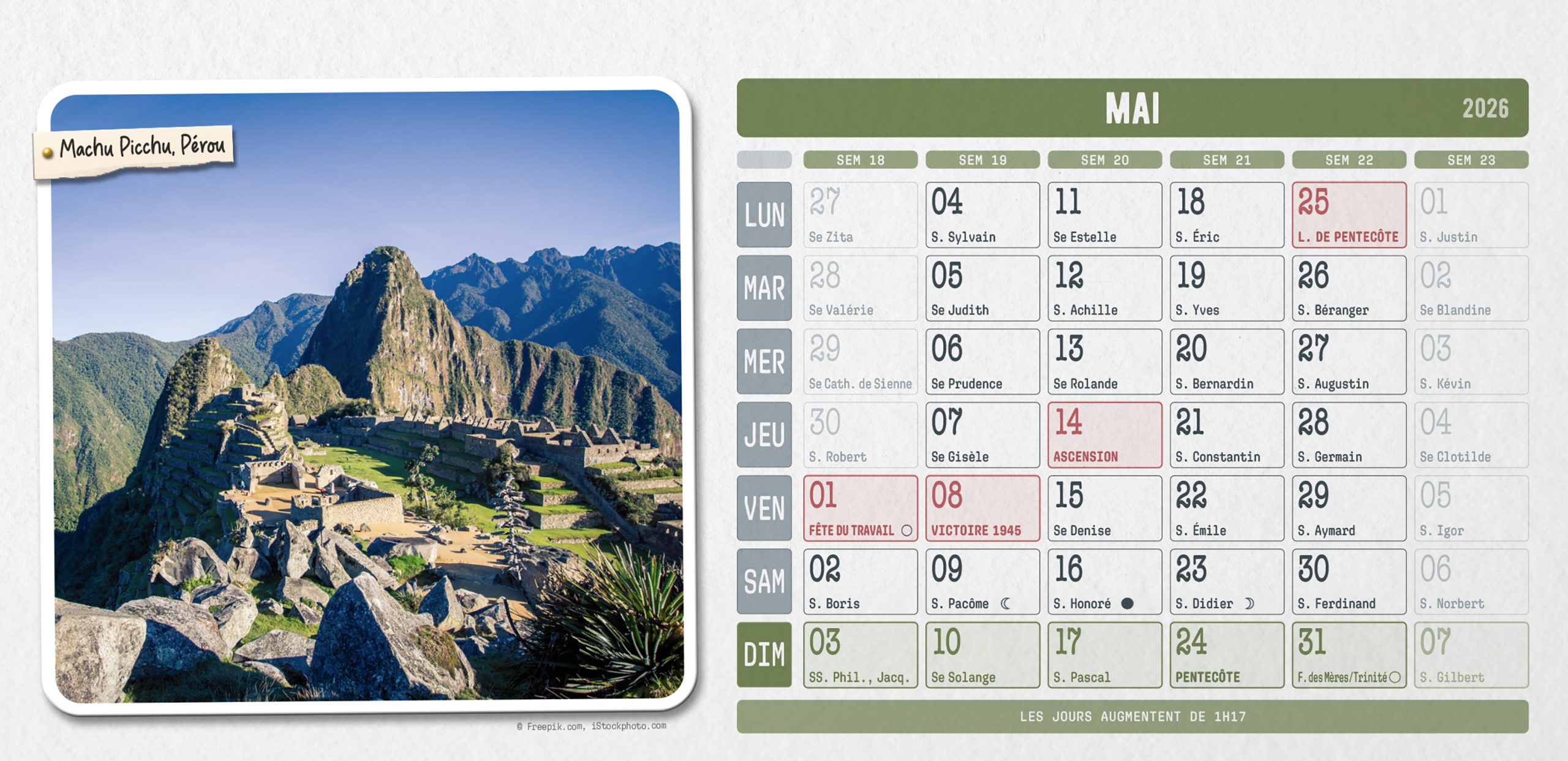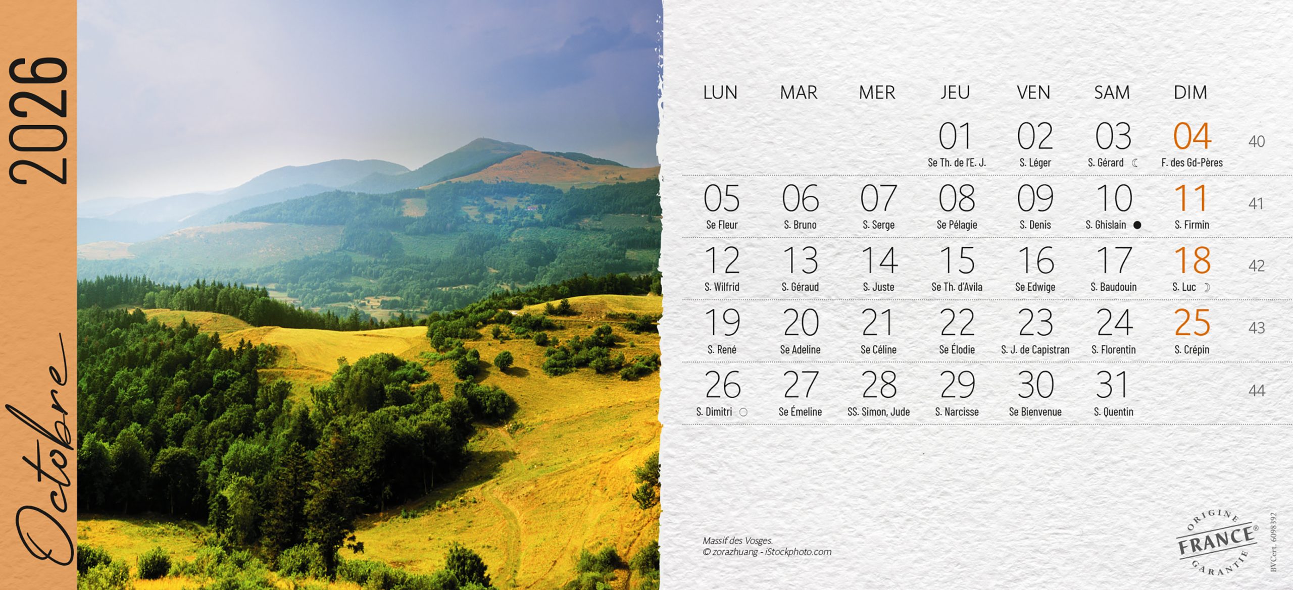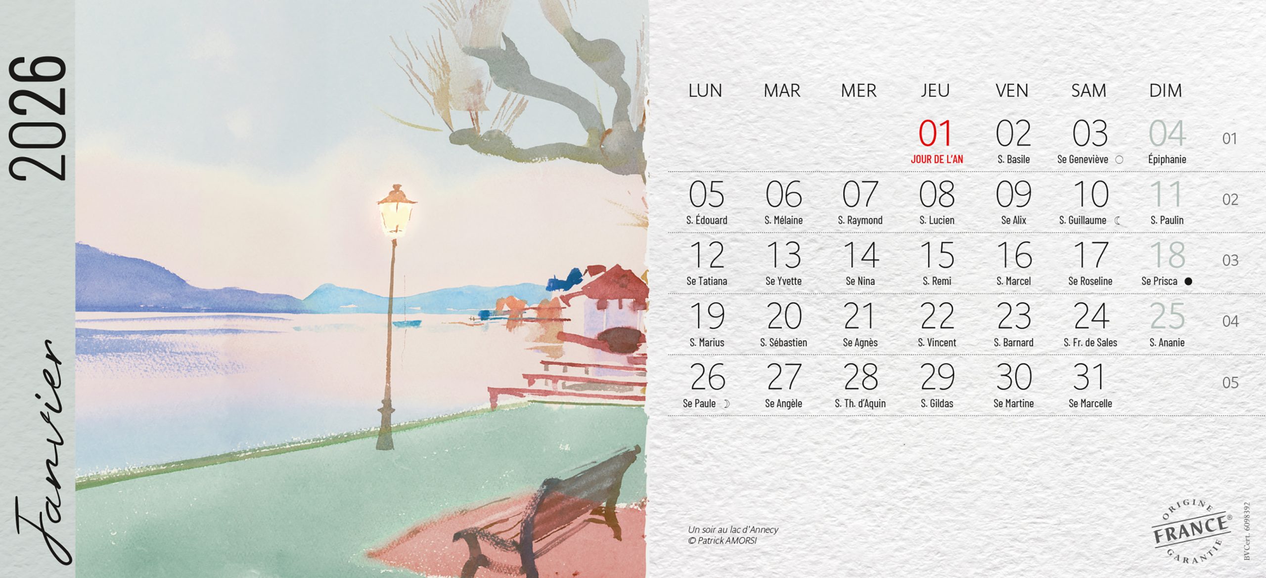 Support pvc blanc. Blocs 13 ou 14 feuillets imprimés recto/verso. Reliure spirale blanche. Grille mensuelle Fêtes / N°semaine / Lunaisons