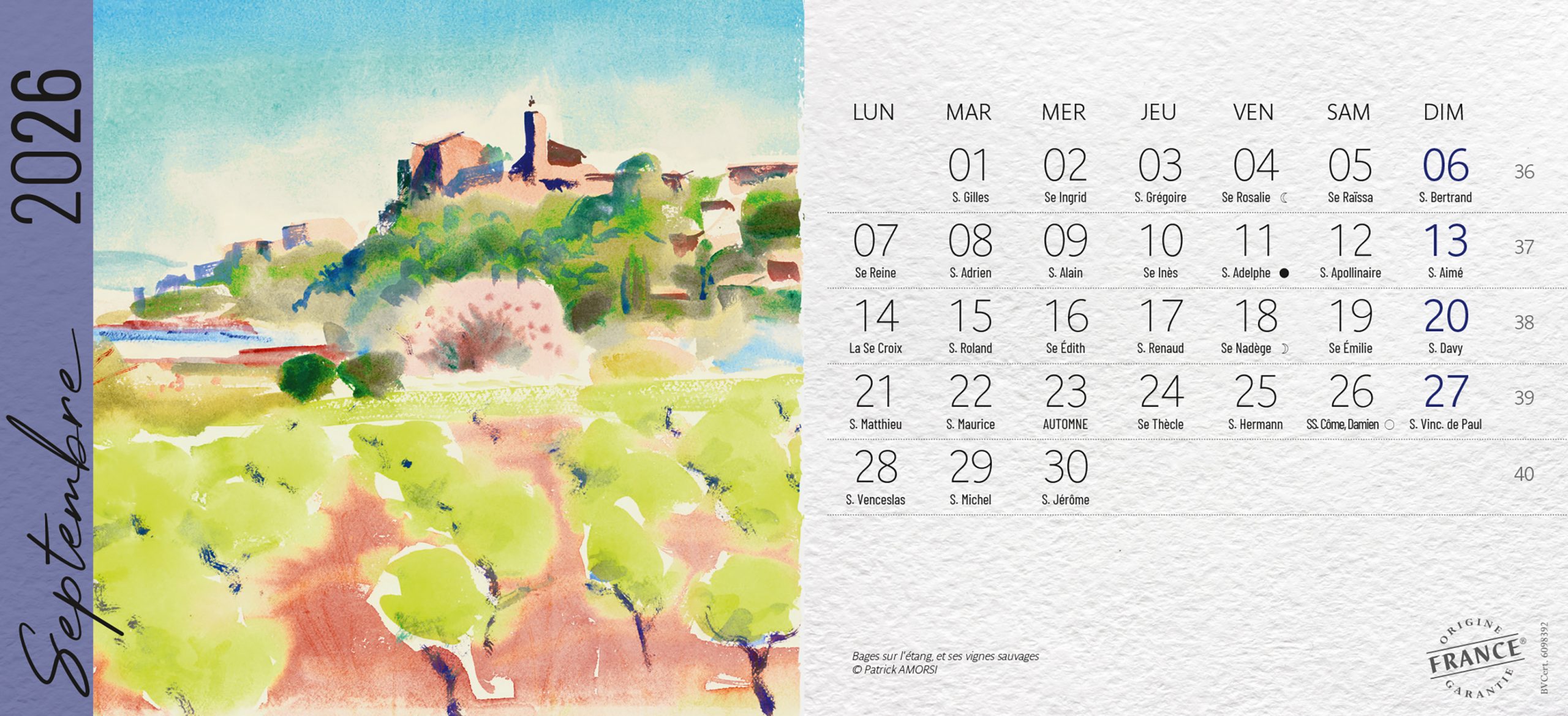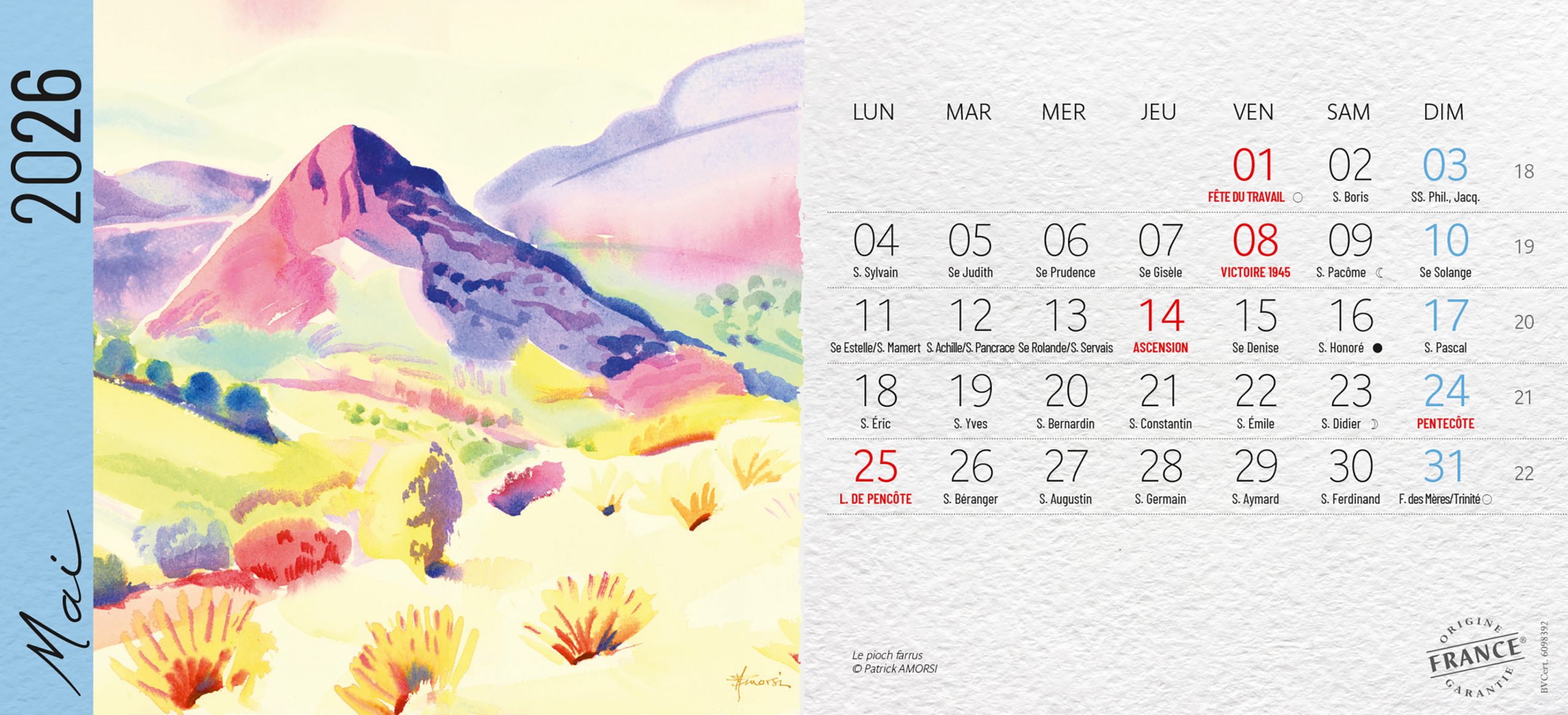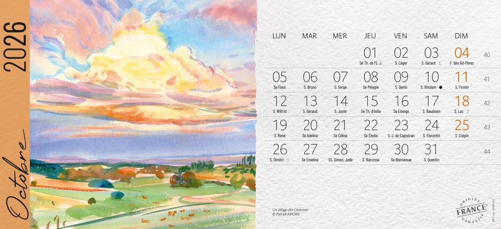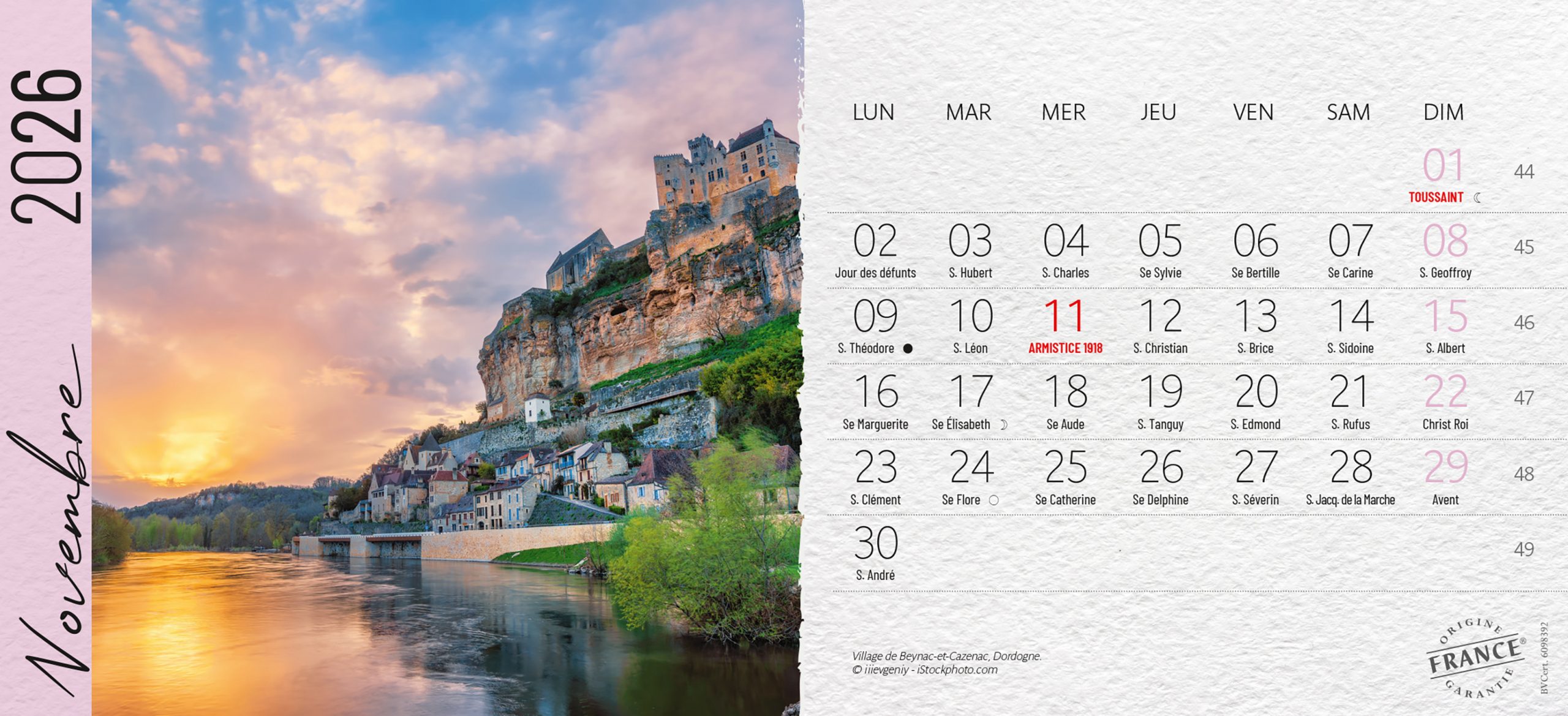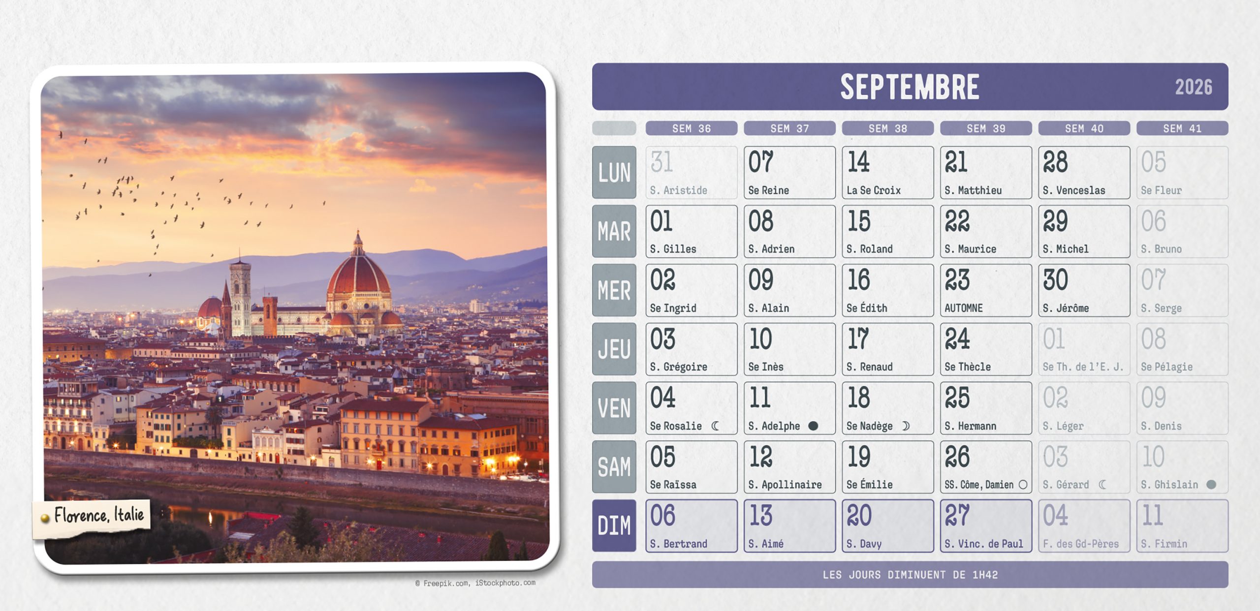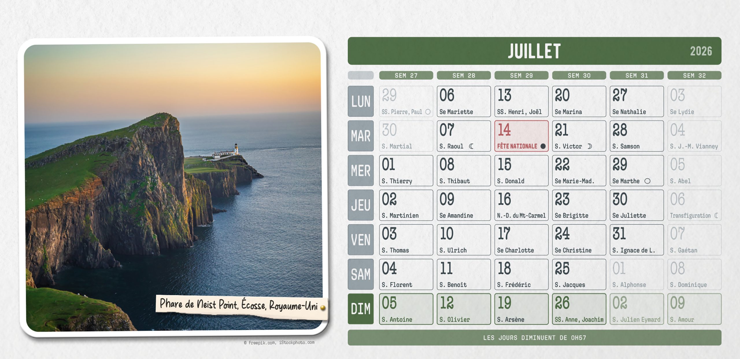 Support pvc blanc. Blocs 13 ou 14 feuillets imprimés recto/verso. Reliure spirale blanche. Grille mensuelle Fêtes / N°semaine / Lunaisons