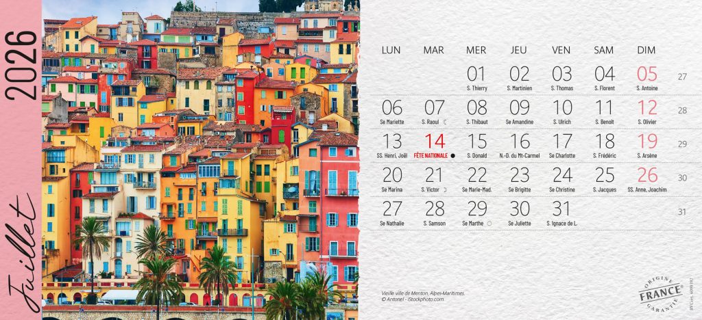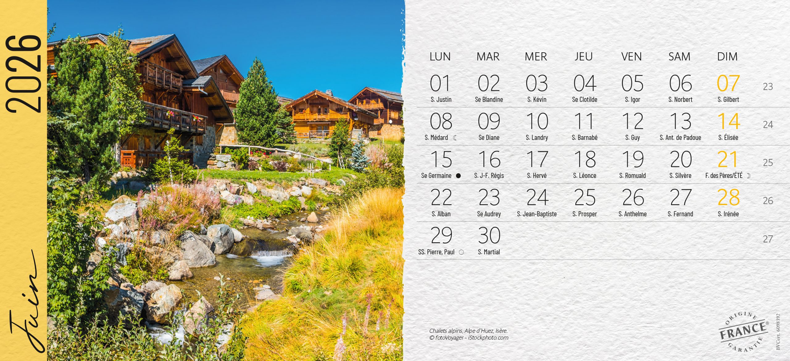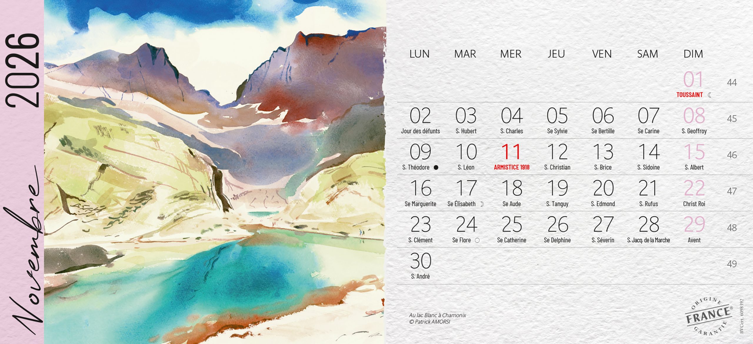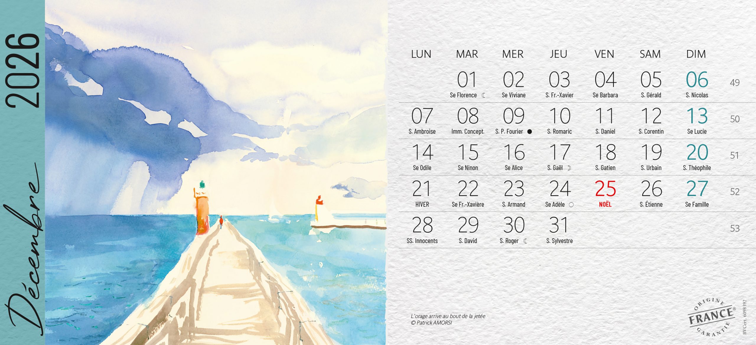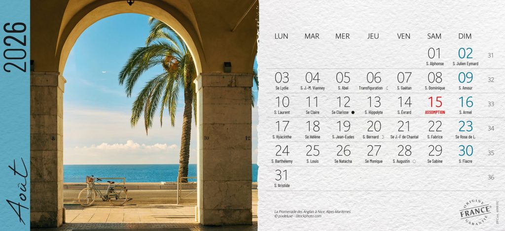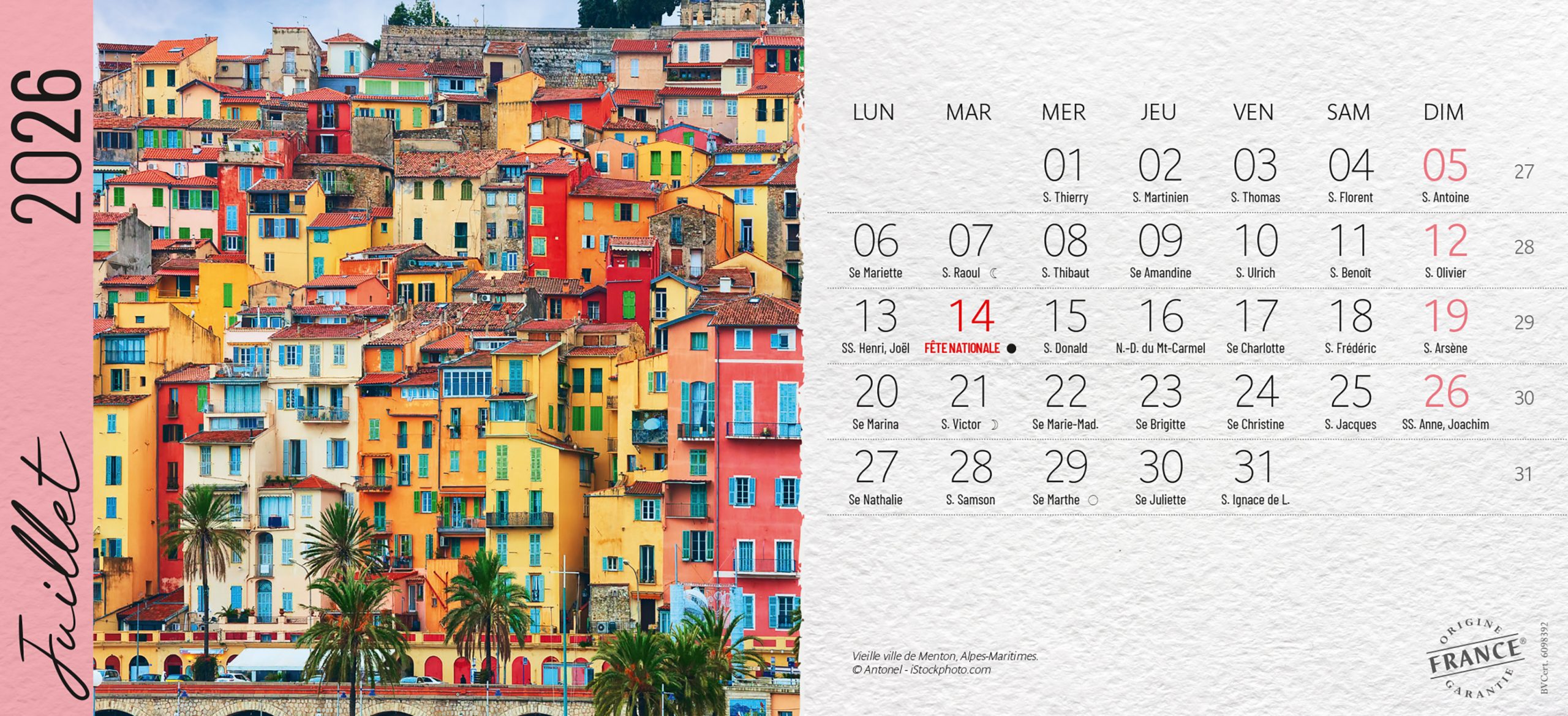 Support pvc blanc. Blocs 13 ou 14 feuillets imprimés recto/verso. Reliure spirale blanche. Grille mensuelle Fêtes / N°semaine / Lunaisons