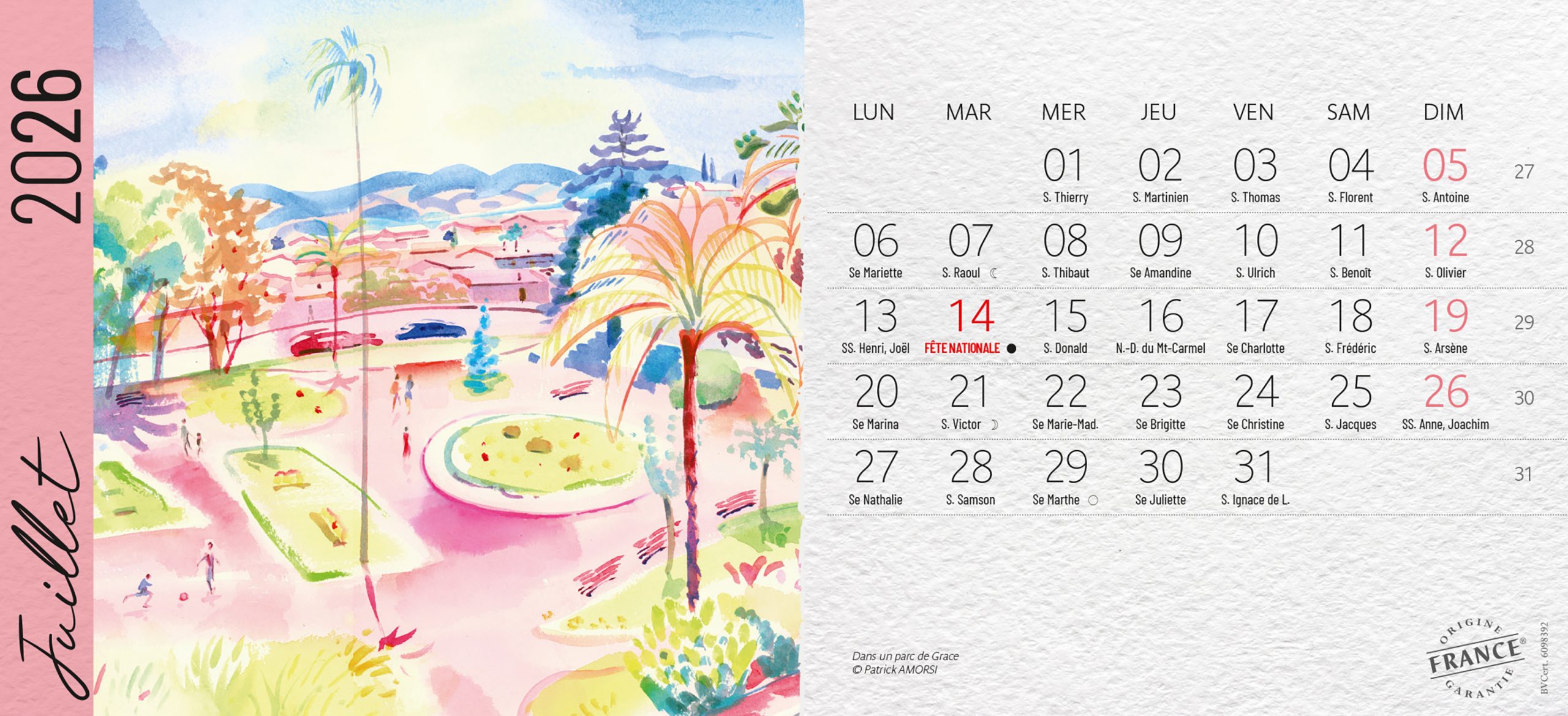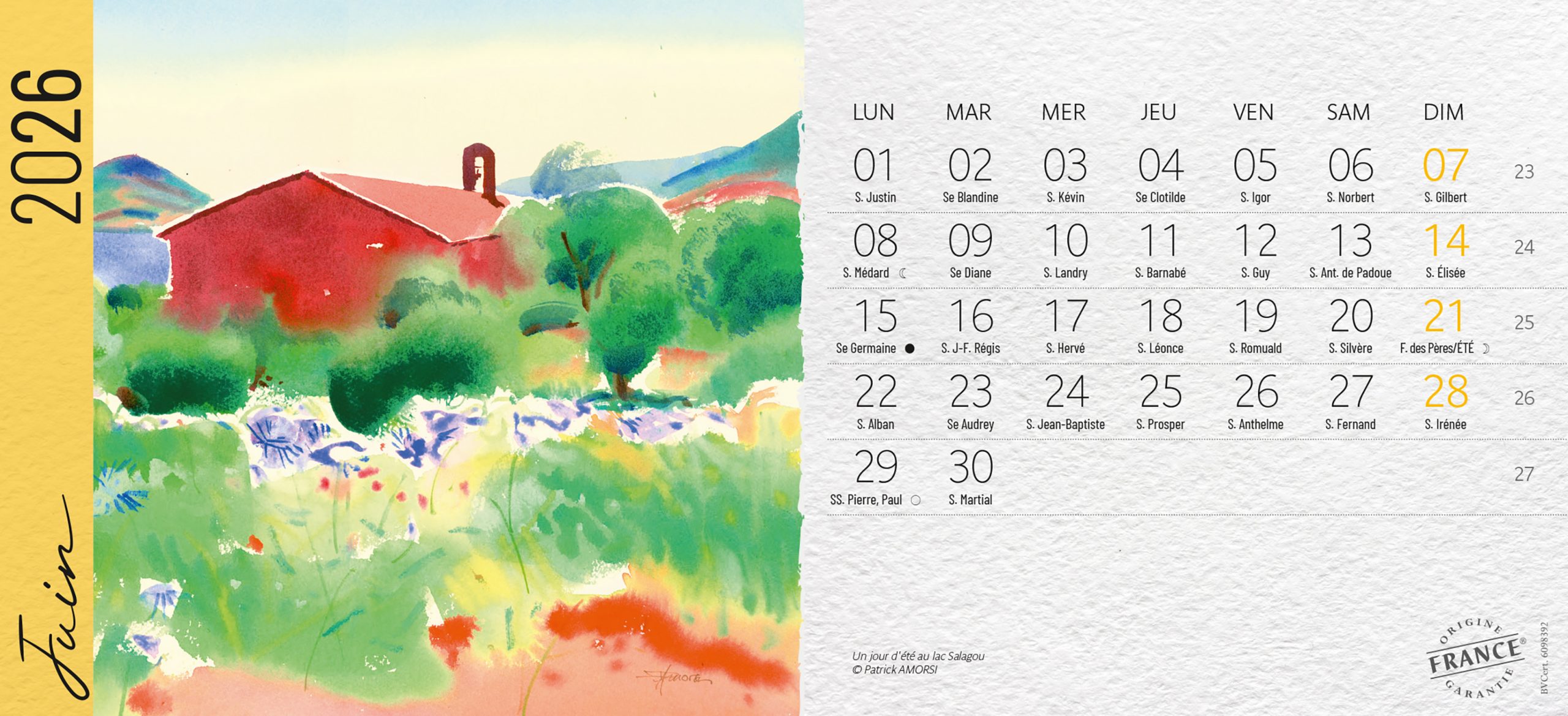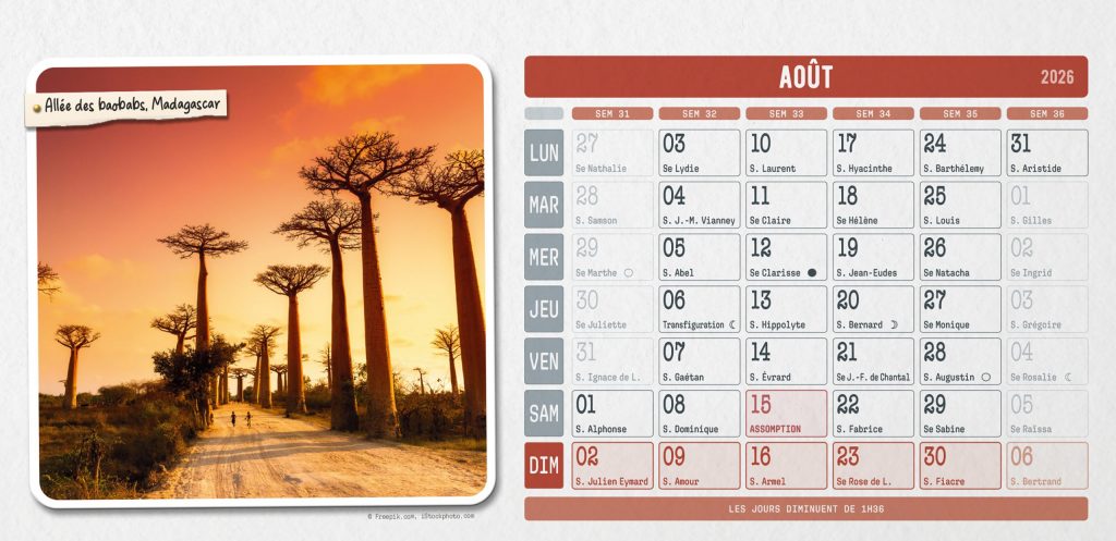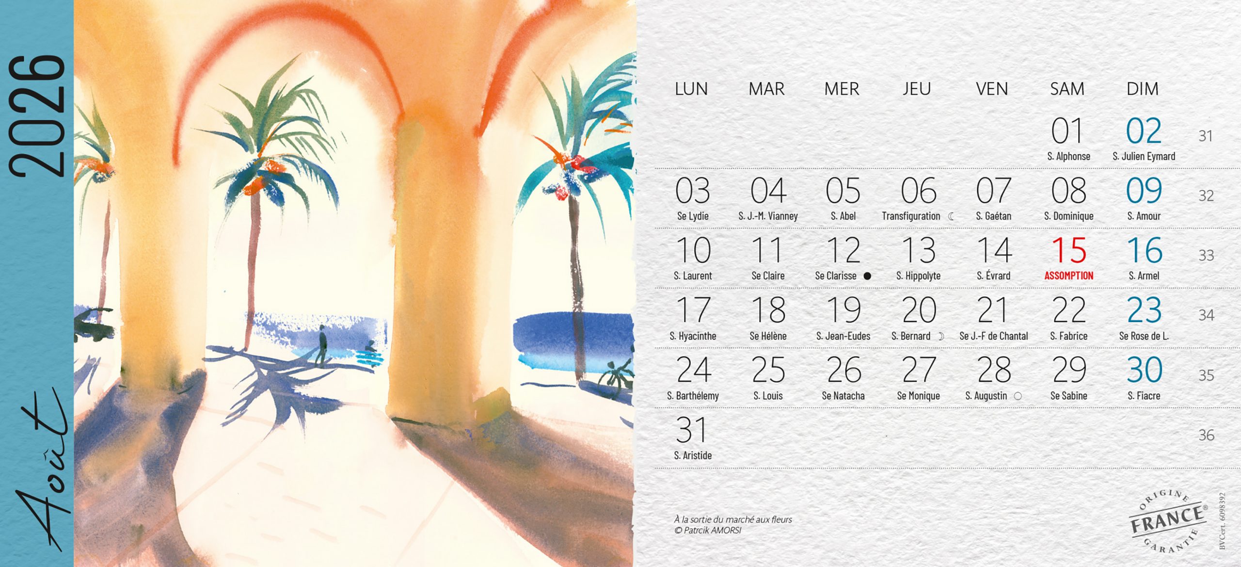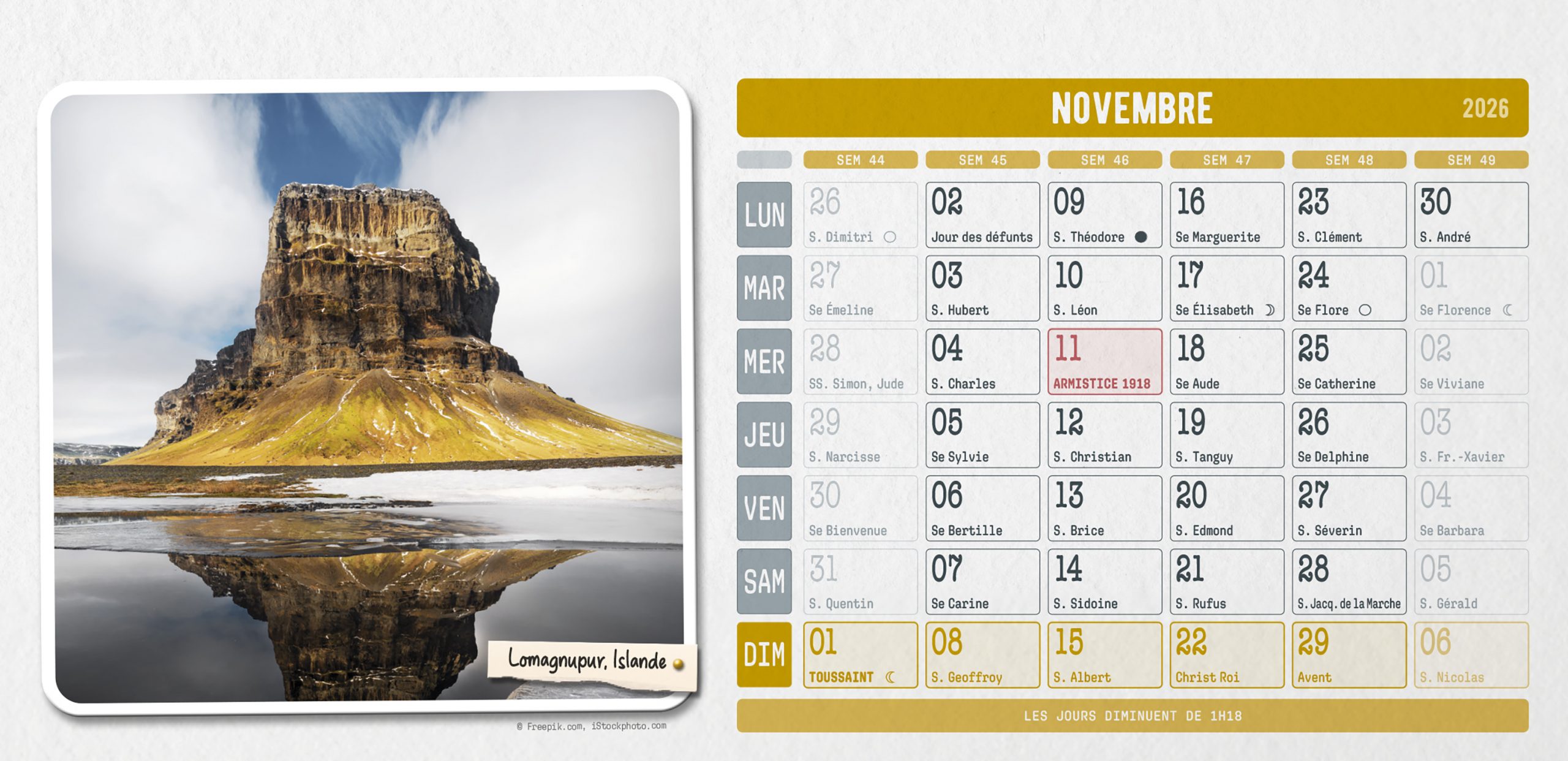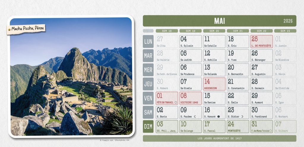 Support pvc blanc. Blocs 13 ou 14 feuillets imprimés recto/verso. Reliure spirale blanche. Grille mensuelle Fêtes / N°semaine / Lunaisons
